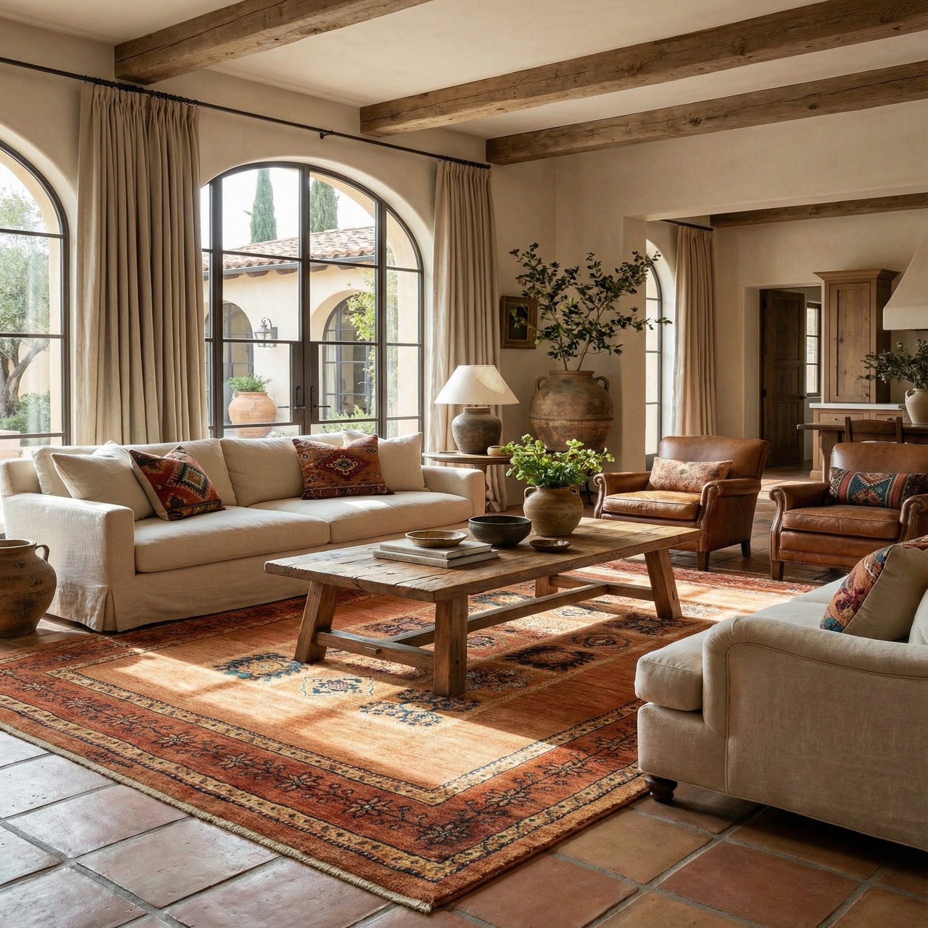 Primary color is Orange. Colors in this rug include: Orange, Orange, Beige, Red, Dark Blue.