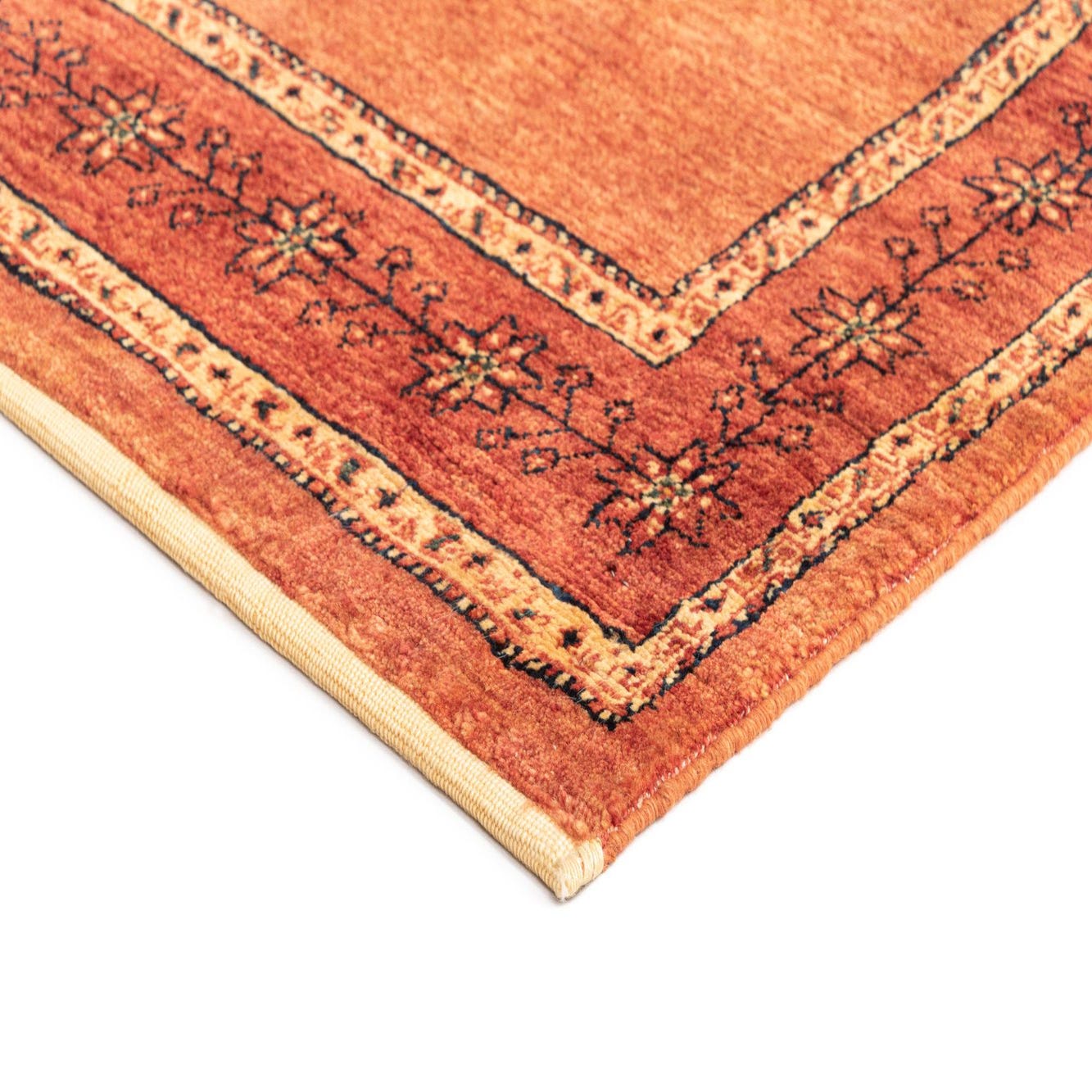 This Kashkuli rug features a vibrant orange background, with a patterned array of geometric and traditional motifs in contrasting shades of beige, red, and dark blue. The handcrafted nature of this piece ensures both its uniqueness and authenticity, crafted from 100% wool which showcases subtle variations in texture and color. The field is adorned with a series of symmetrically arranged medallions, each detailed with intricate designs that speak to the rug's hand-made craftsmanship. A detailed border frames the rug, providing a structured outer layer that complements the central pattern.