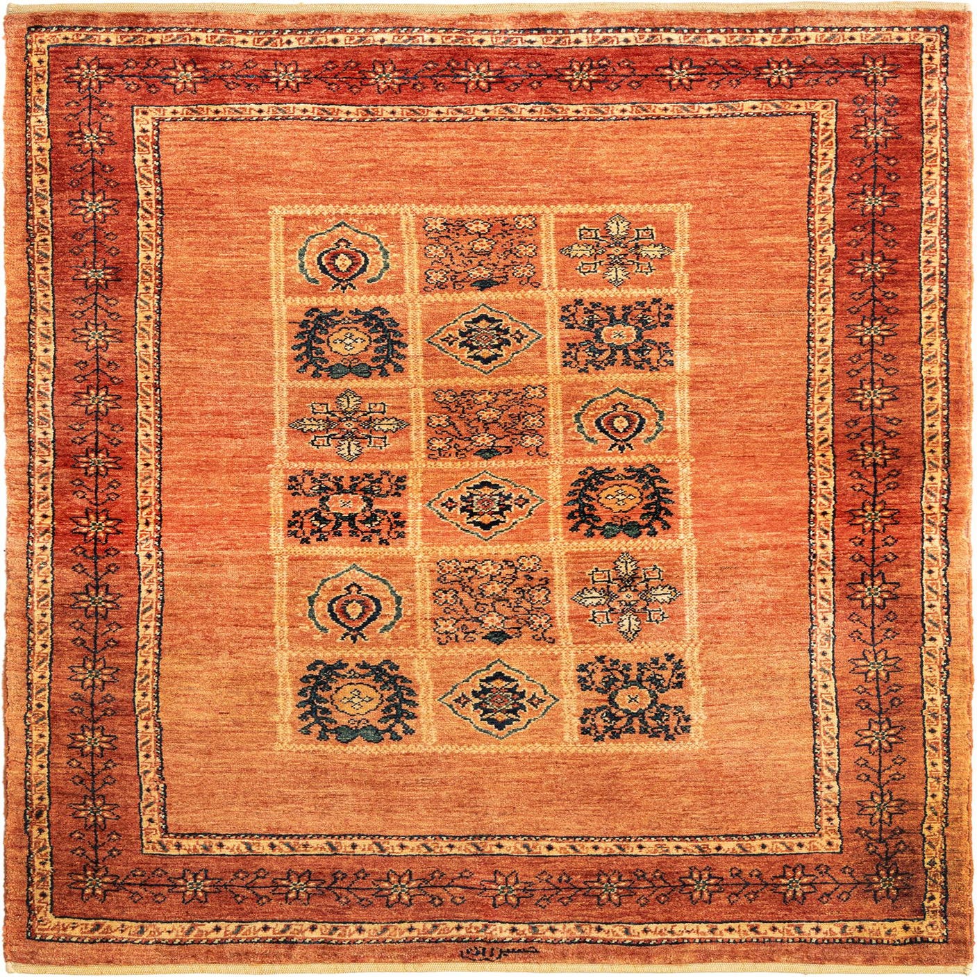 A 3x5 rectangular Kashkuli Persian rug in warm orange tones with a central grid of varied traditional motifs and a detailed border.