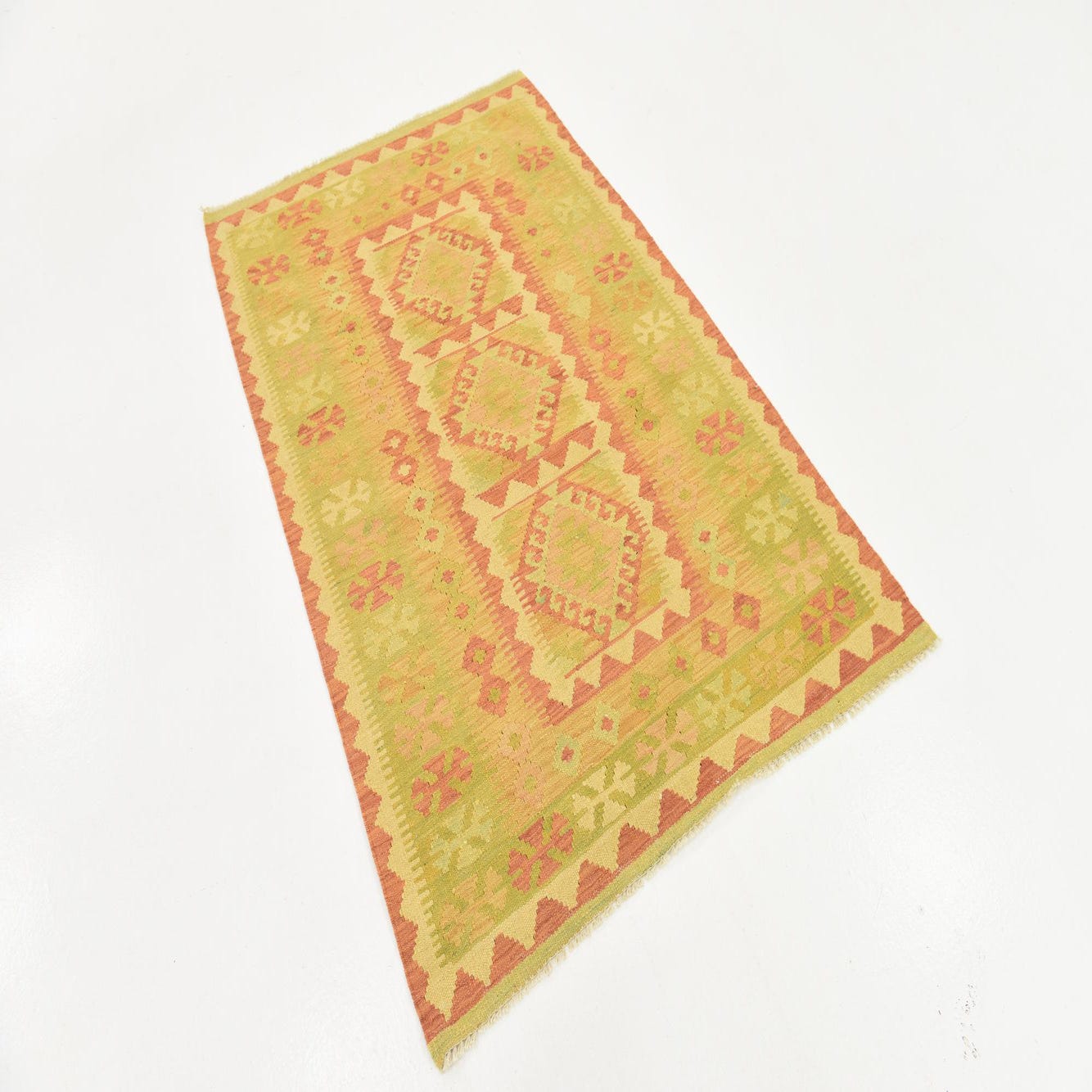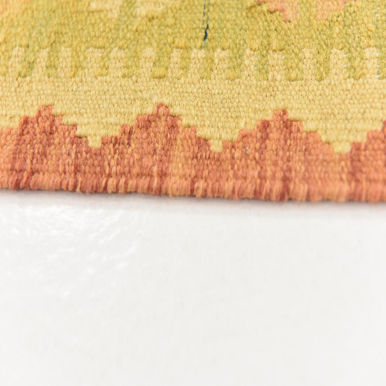 The Kilim Waziri rug is a handwoven piece that showcases a traditional geometric pattern with a modern color palette. Constructed from 100% wool, this 3x5 rug's texture offers a natural and comfortable underfoot experience, inherent to its quality materials. The orange background provides a warm and inviting canvas for the intricate design, composed of cream, green, gold, and olive accents. Finished with a fringe that adds an element of classic design detail to its overall appearance.