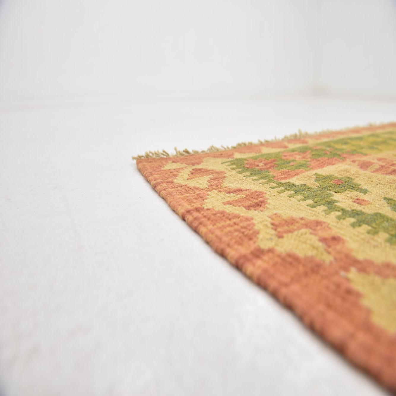 A 3x5 rectangular Kilim Waziri rug featuring a traditional tribal pattern in shades of orange, green, and cream.