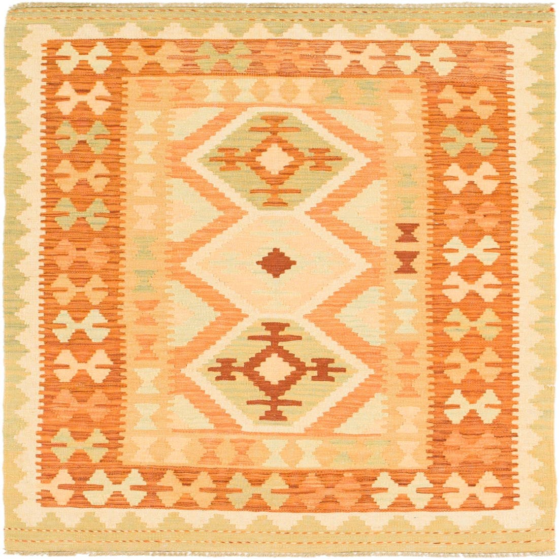 A 3x5 rectangular Kilim Waziri rug featuring a traditional tribal pattern in various shades of orange and light green.