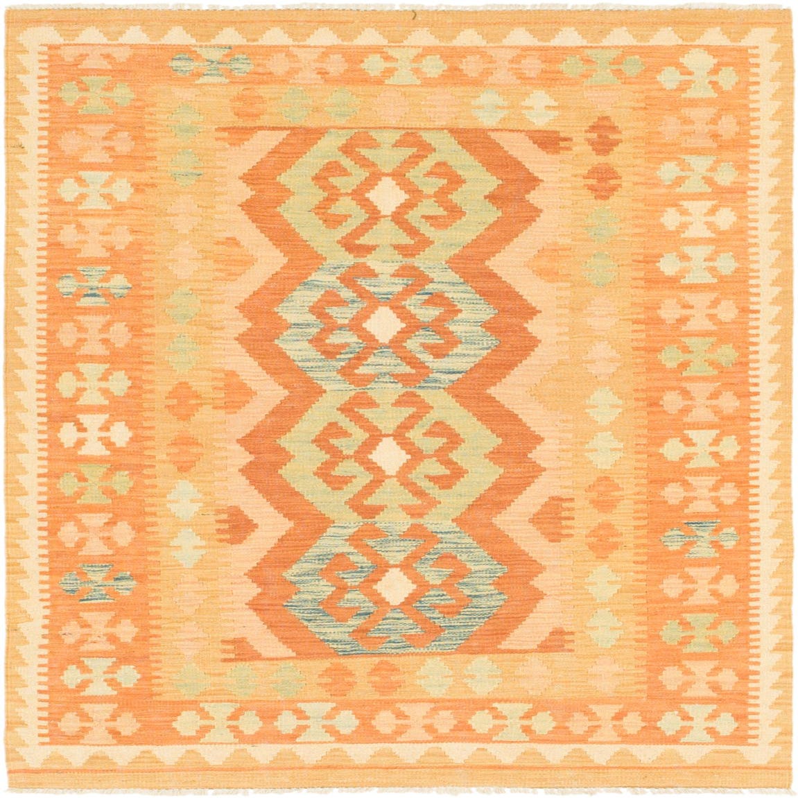 A 3x5 rectangular Kilim Waziri rug in shades of orange, peach, and light blue with a traditional tribal pattern.
