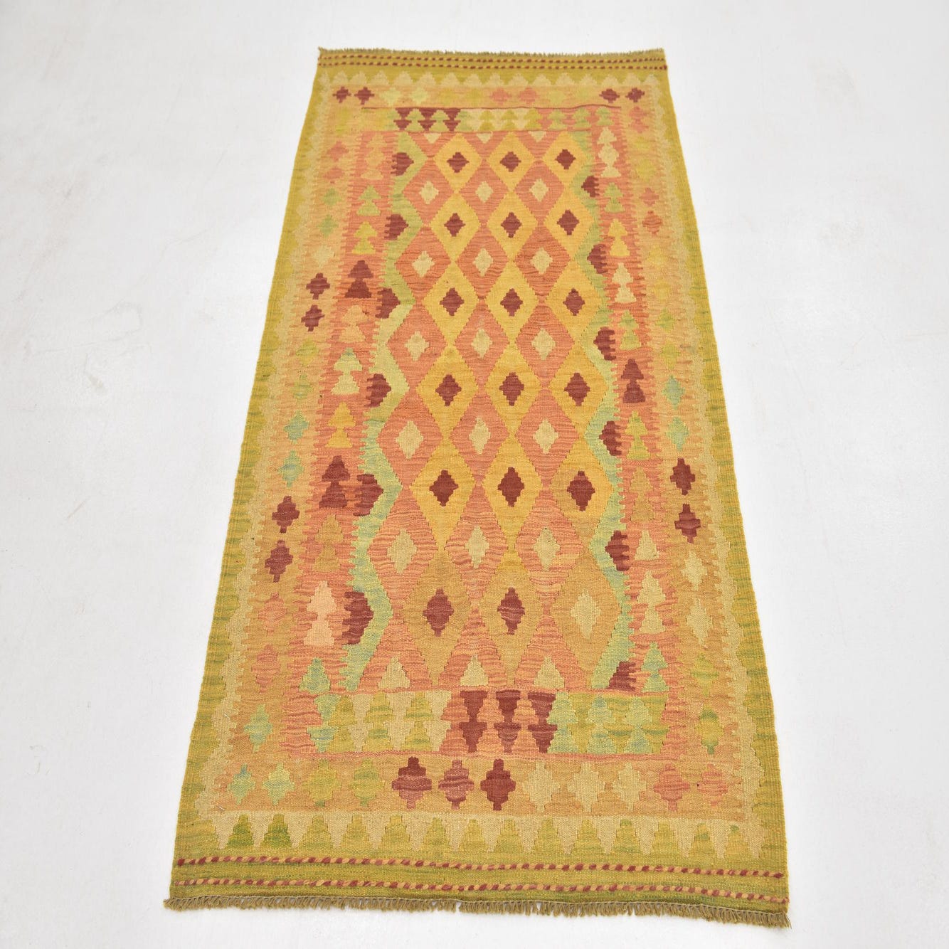 A 3x5 rectangular Kilim Waziri rug featuring a traditional tribal pattern in various shades of orange, yellow, and subtle green.