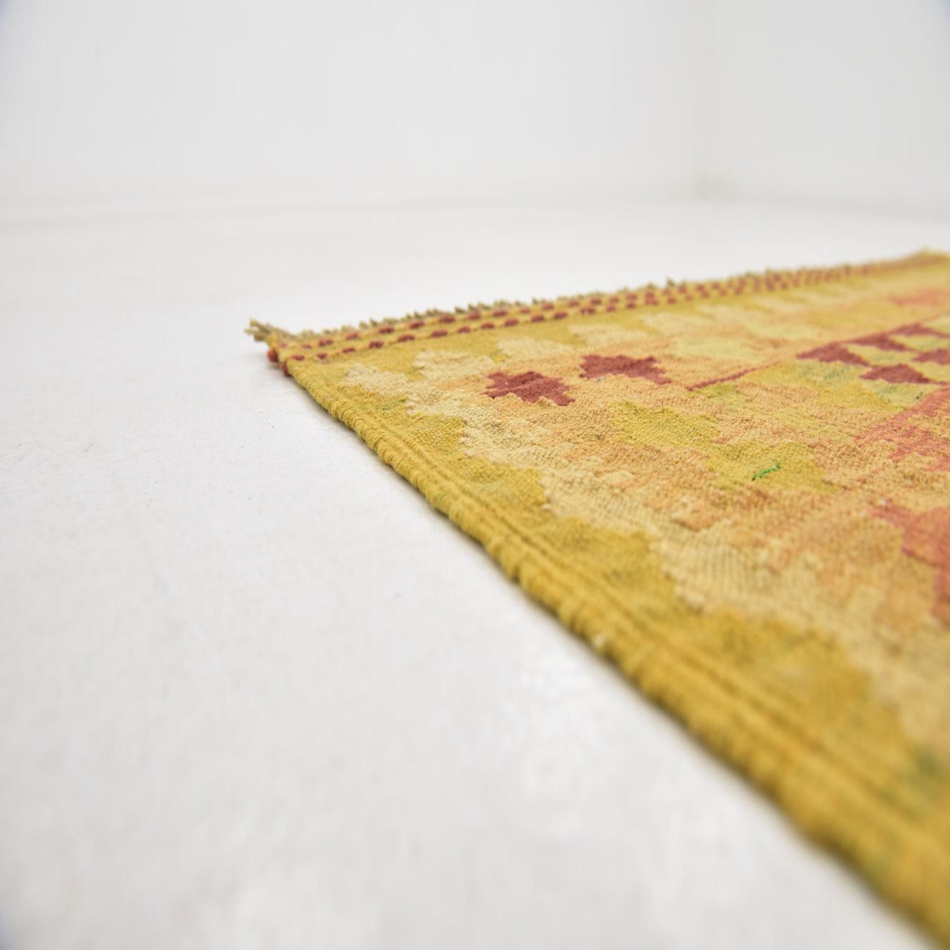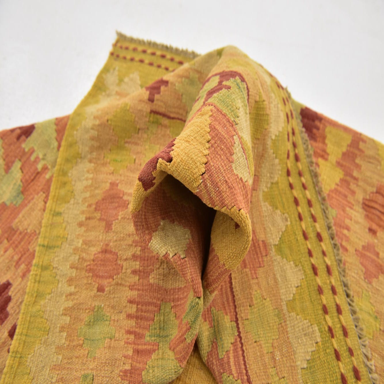This rug's distinct color palette and geometric motifs lend itself to a variety of interior design schemes. Its warm tones and inviting pattern would be well-suited for Bohemian, Southwestern, or eclectic room settings, acting as a focal point or a complementary accent in living spaces. In a minimalist or contemporary environment, the Kilim Waziri rug could serve as a splash of color, juxtaposing clean lines with its intricate pattern work. Its woolen texture makes it a cozy addition to a reading nook or office, adding both visual warmth and tactile comfort.