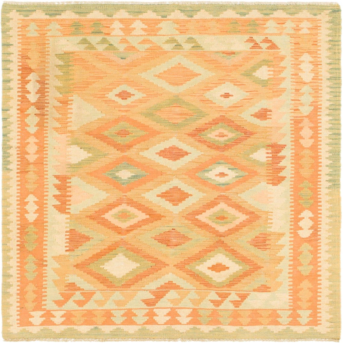 A 3x5 rectangular Kilim Waziri rug featuring a traditional tribal diamond pattern in various shades of orange and hints of sage green.