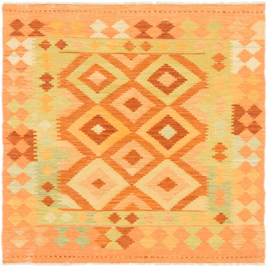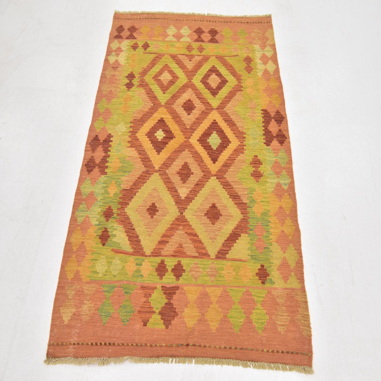 A 3x5 rectangular Kilim Waziri rug featuring a vibrant tribal pattern in shades of orange, peach, and light green.