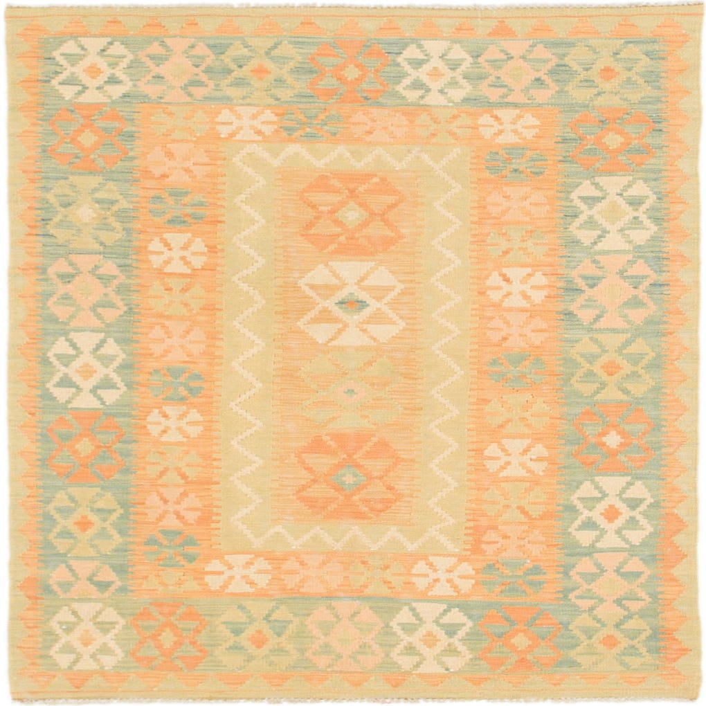 The Kilim Waziri Collection presents a 3x5 hand-woven rug composed of 100% wool, offering a natural feel underfoot. The design is a well-executed display of geometric patterns that give a nod to traditional kilim motifs. A vibrant spectrum of colors that includes orange as the background, complemented by cream, green, tan, and gold accents, blends to create a warm and inviting palette suitable for various interior settings.