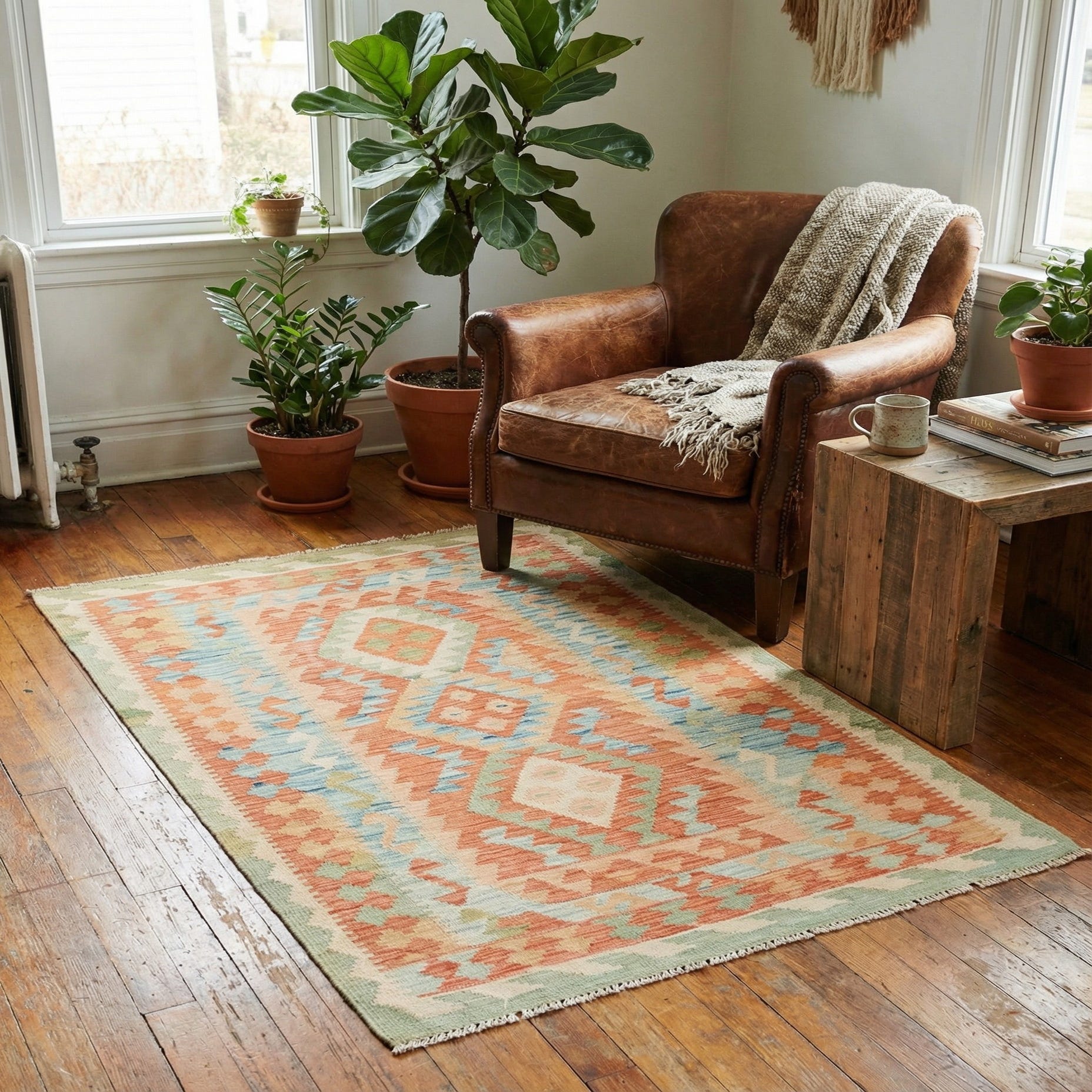 3' 2 x 4' 10 Hand Woven Kilim Waziri Wool Rug