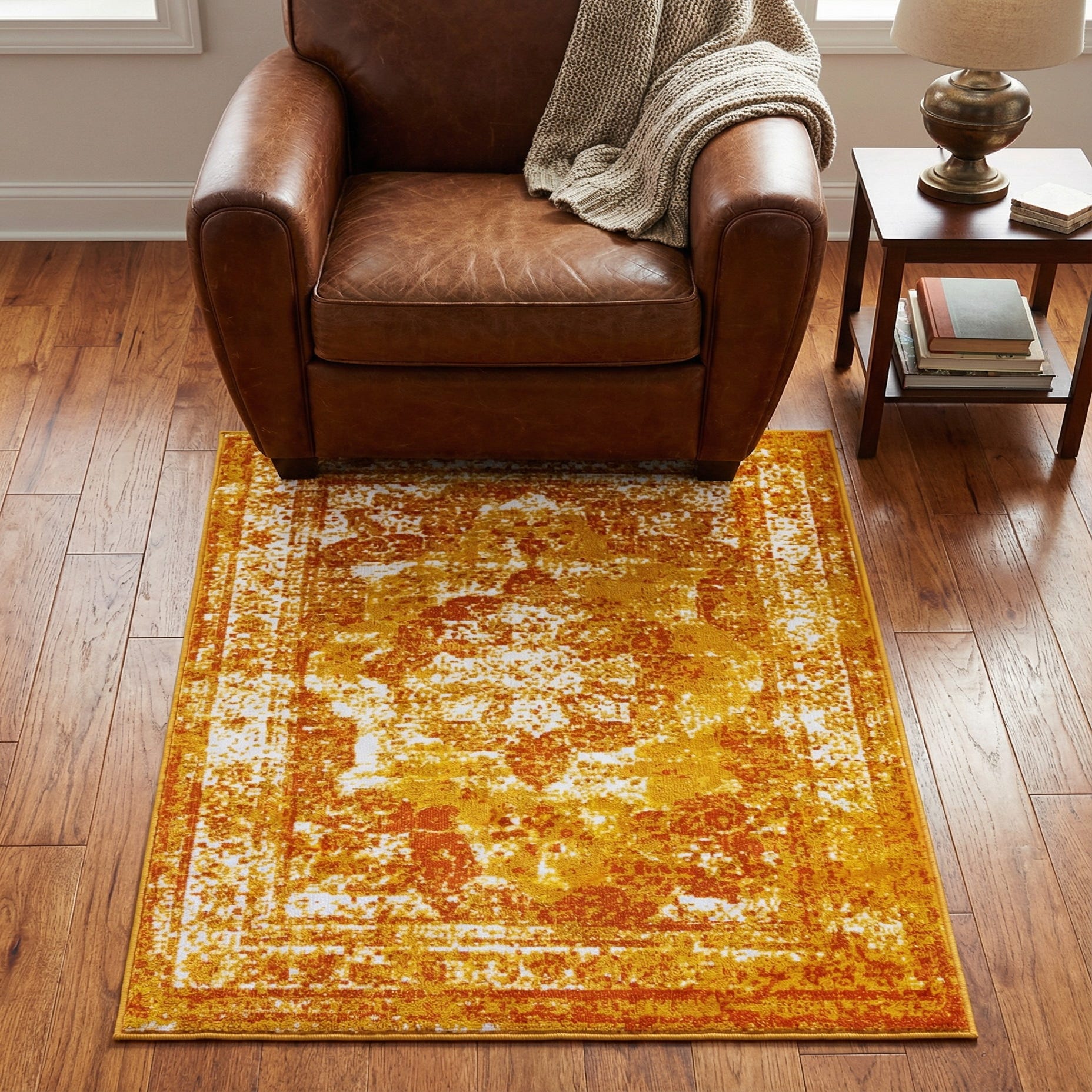 Machine-made of 100% polypropylene, the rug has a low-profile pile with a soft, synthetic hand and a subtle sheen that catches the eye. The tactile surface feels smooth underfoot while the distressed pattern helps hide everyday wear. Works well layered under a low coffee table in a mid-century or eclectic living room, anchored at the foot of a bed in a warm, bohemian bedroom, or brightening an entryway or sunlit kitchen that benefits from a bold, cozy accent.
