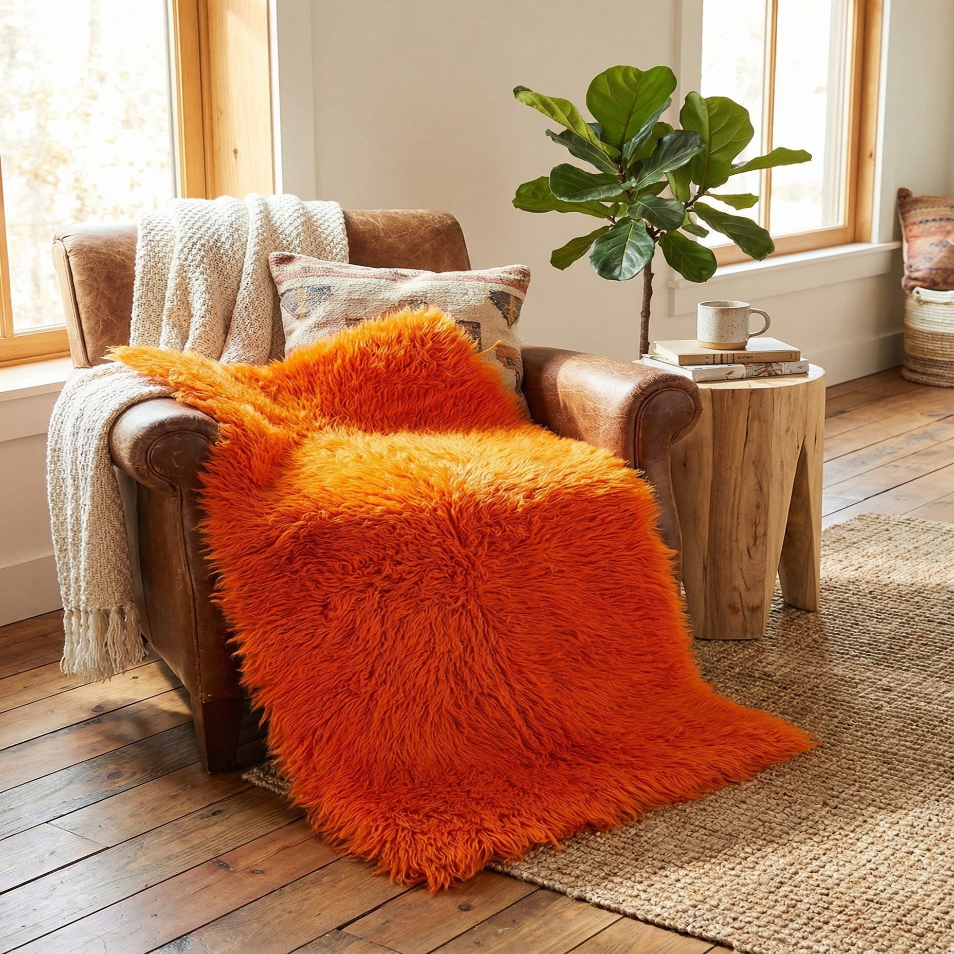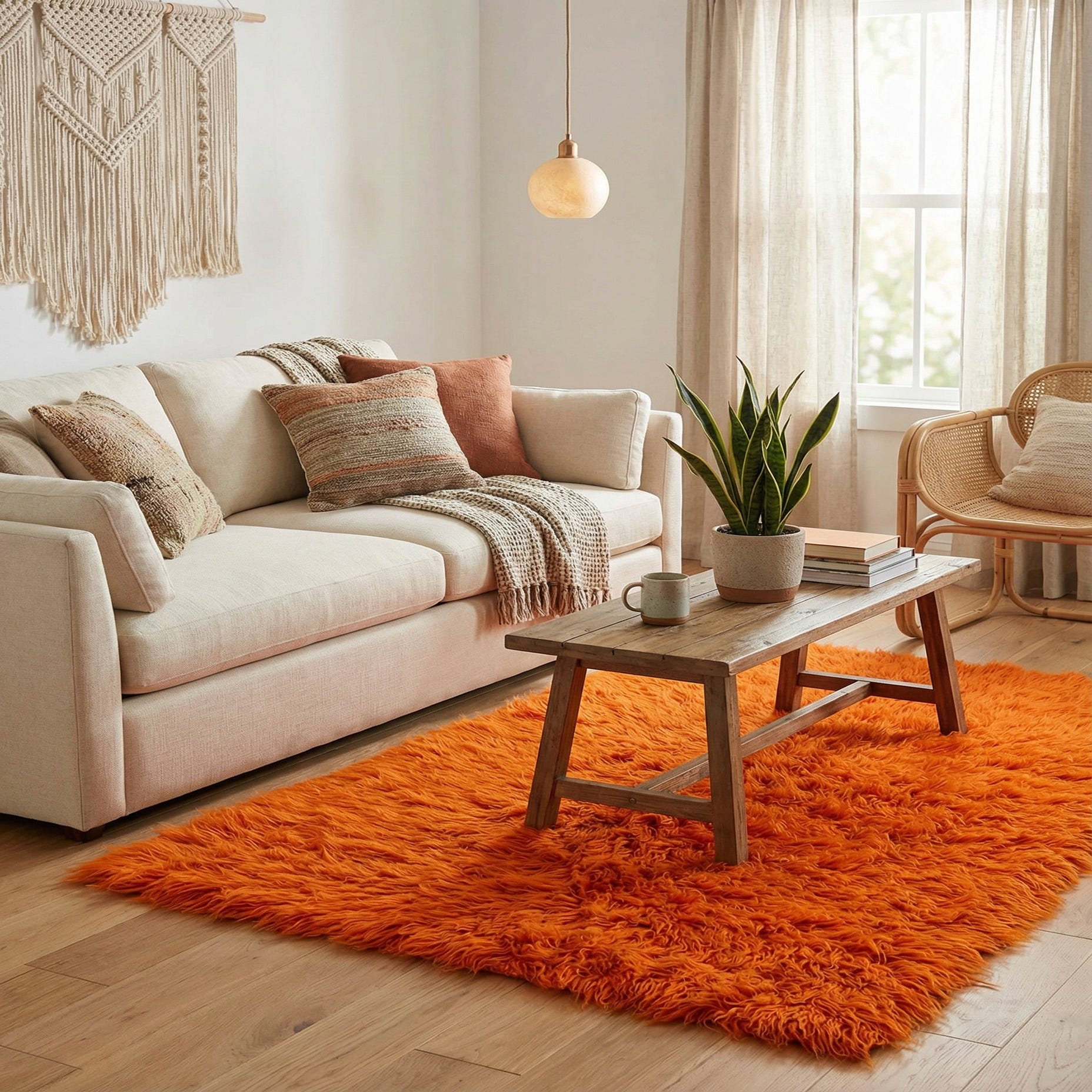 A vibrant orange 3x5 rectangular shag rug with a plush, shaggy texture, perfect for adding warmth to any indoor space.