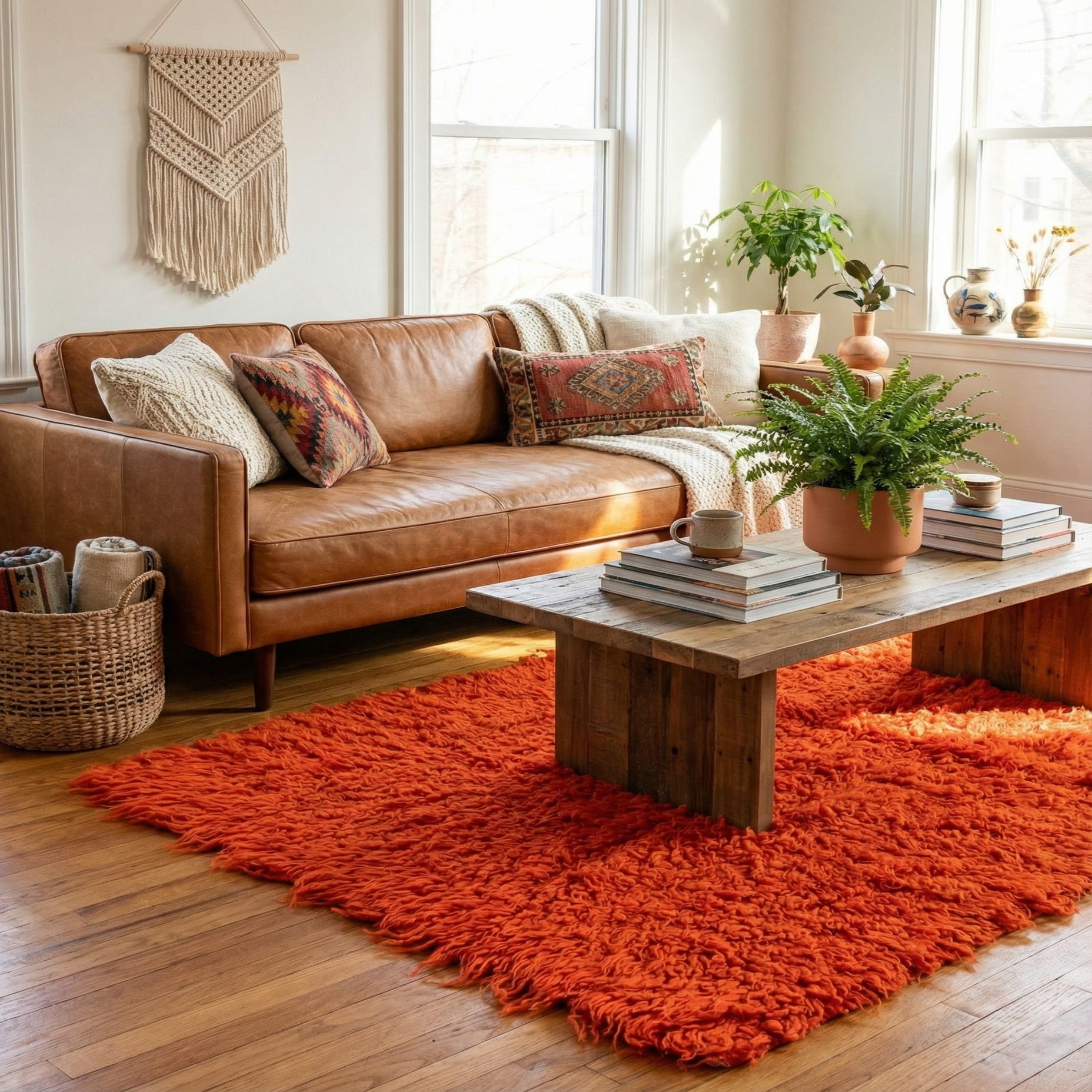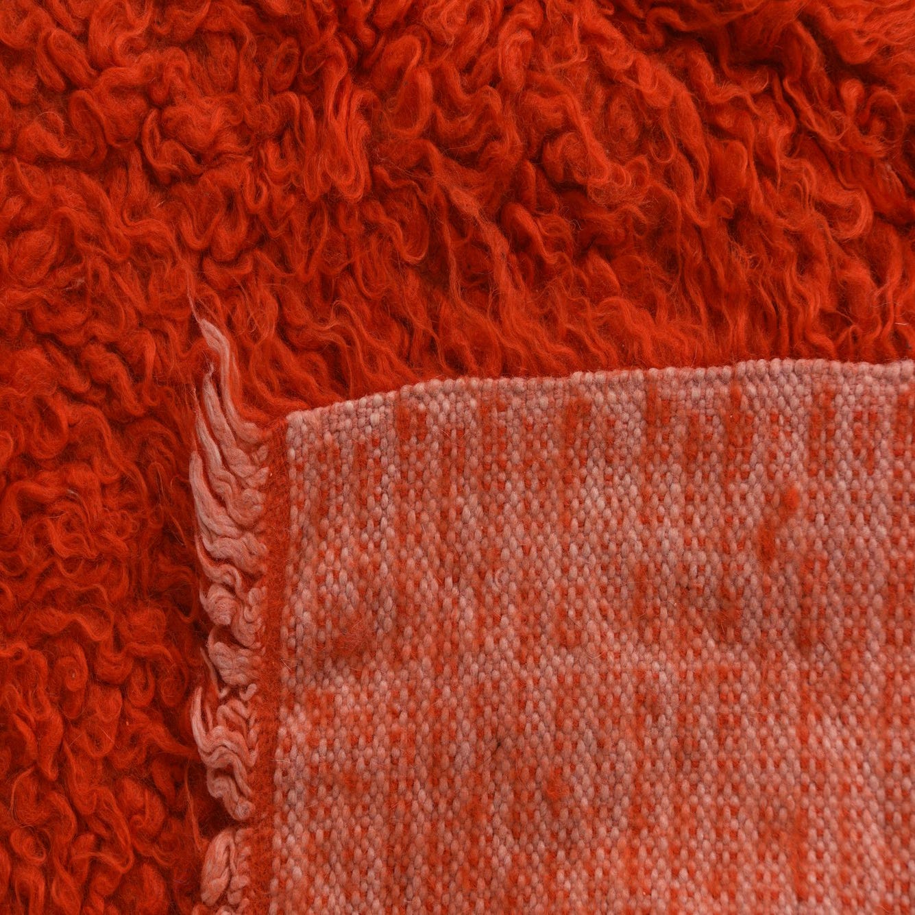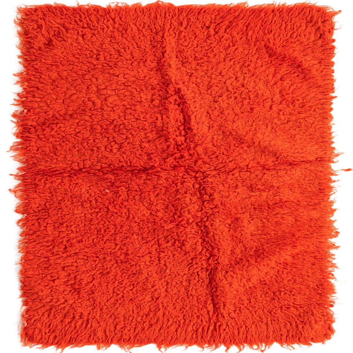A vibrant 3x5 rectangular orange shag rug, handmade from 100% wool, with a plush, textured pile.