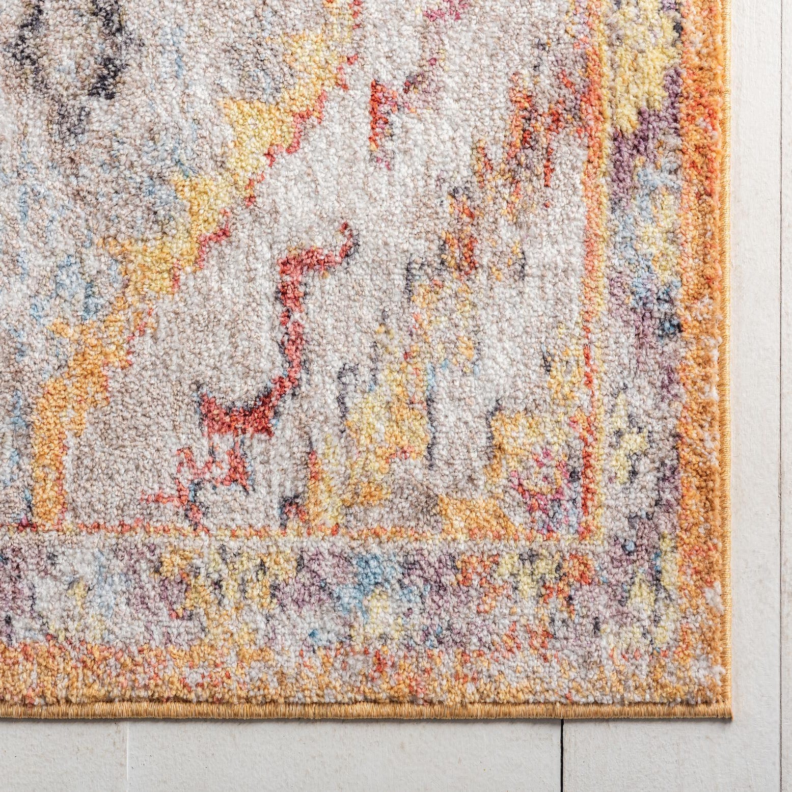 Primary color is Orange. Colors in this rug include: Orange, Beige, Black, Blue, Burgundy, Ivory, Yellow, Pink.