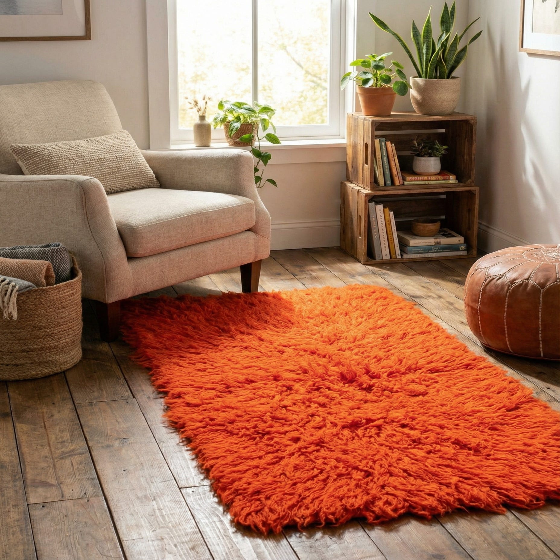 The lack of a defined pattern means this piece can seamlessly integrate into various interior design styles, from bohemian to modern. Its lively orange hue would complement neutral spaces by adding a pop of color or enliven rooms with earth tones, blues, or grays. In a hallway, this runner would act as a compelling focal point, while in a living space, it could serve to delineate areas or add a cozy element beside furniture.