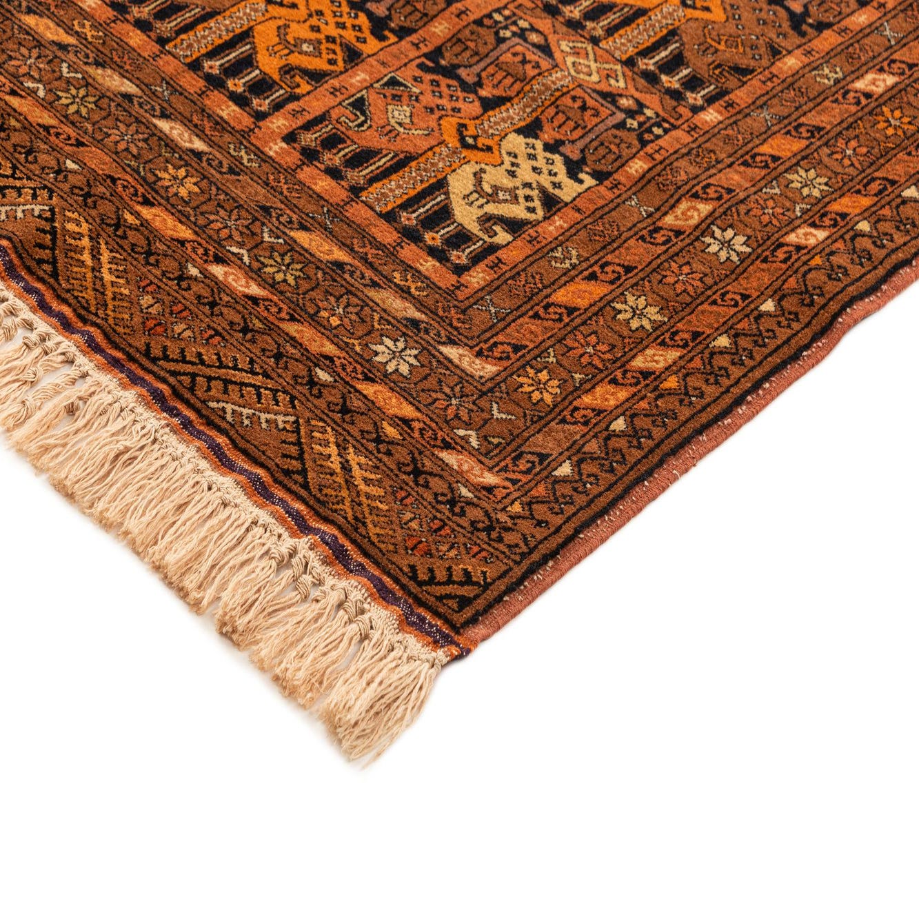 A 4x6 rectangular Afghan tribal rug in rich oranges, black, and tan, featuring intricate patterns and fringe.