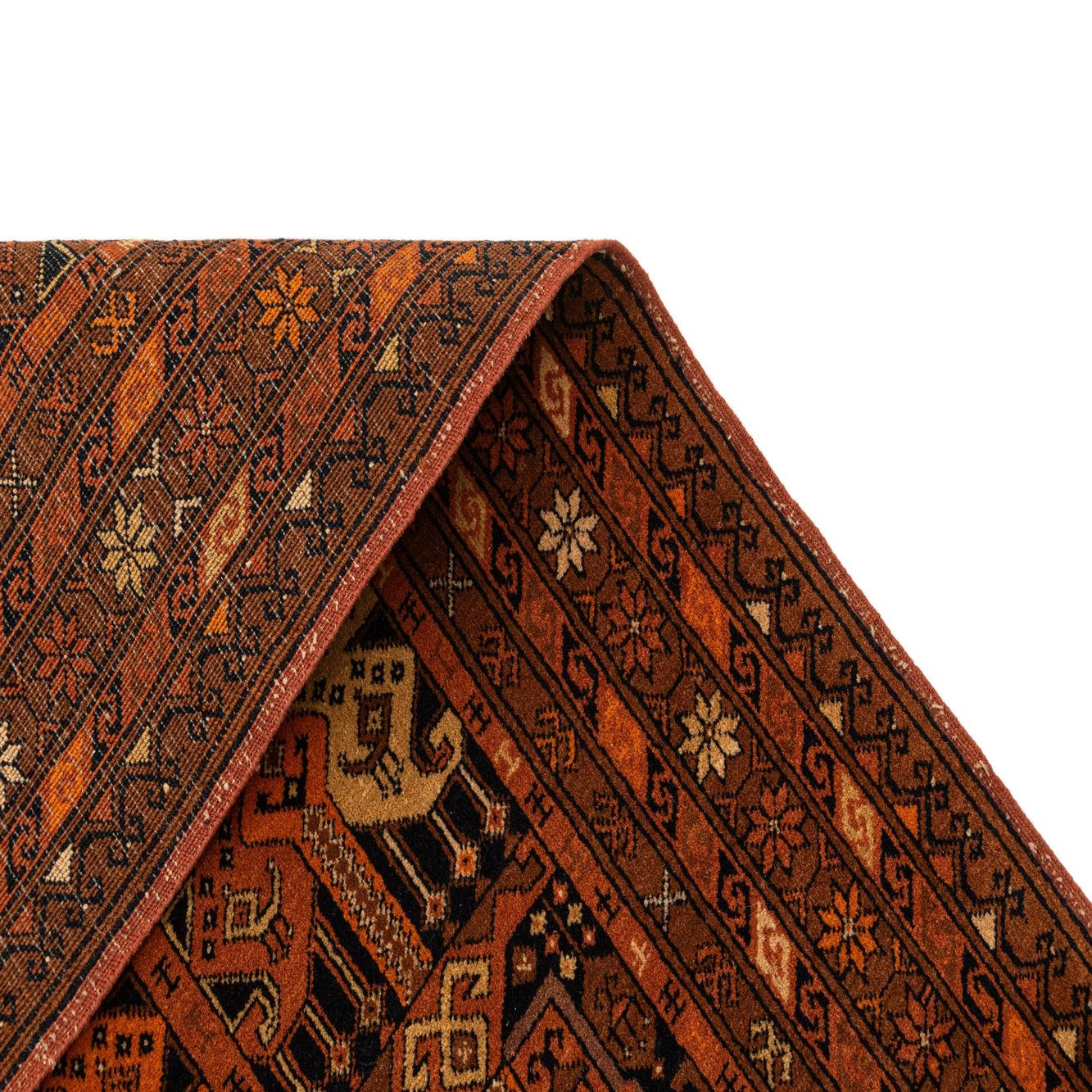 Hand-knotted in virgin sheep wool, this rug shows a classic tribal layout with repeating gul-style medallions set across a warm orange field. Rust, deep brown, black and cream accents form the geometric motifs, while multiple guard borders with small floral and linear patterns frame the central design. The short, dense pile has a soft, tactile quality and a natural woolen sheen, and the natural fringe at the ends adds a finished, handmade touch.