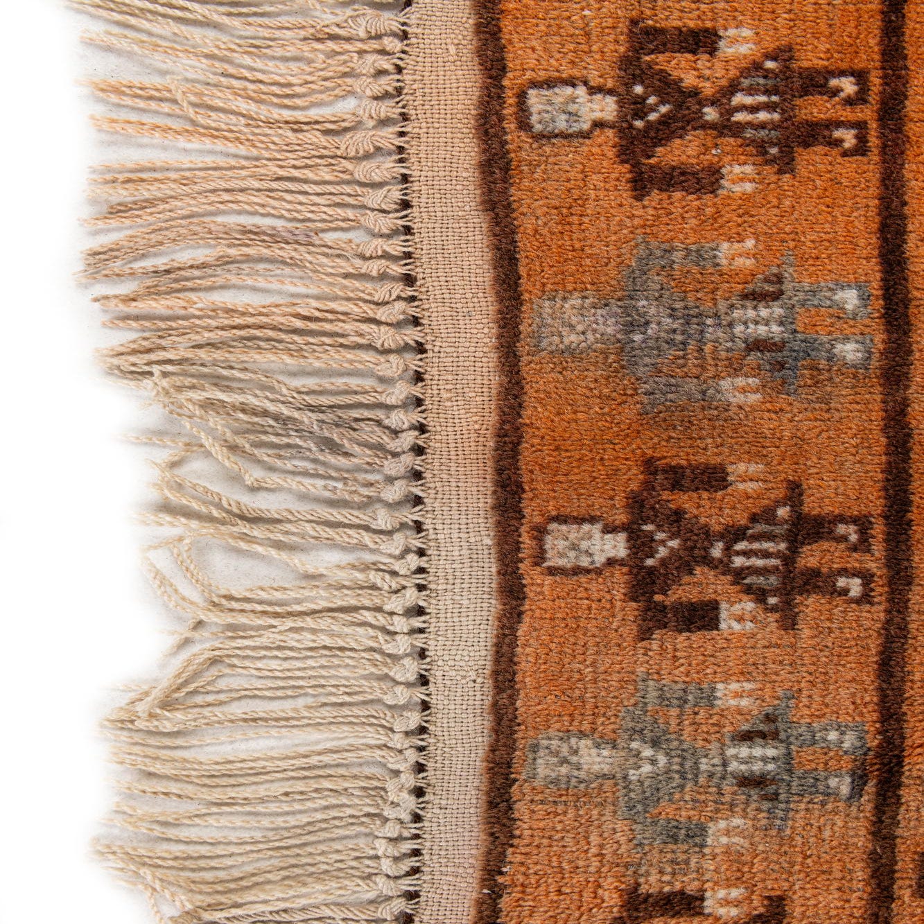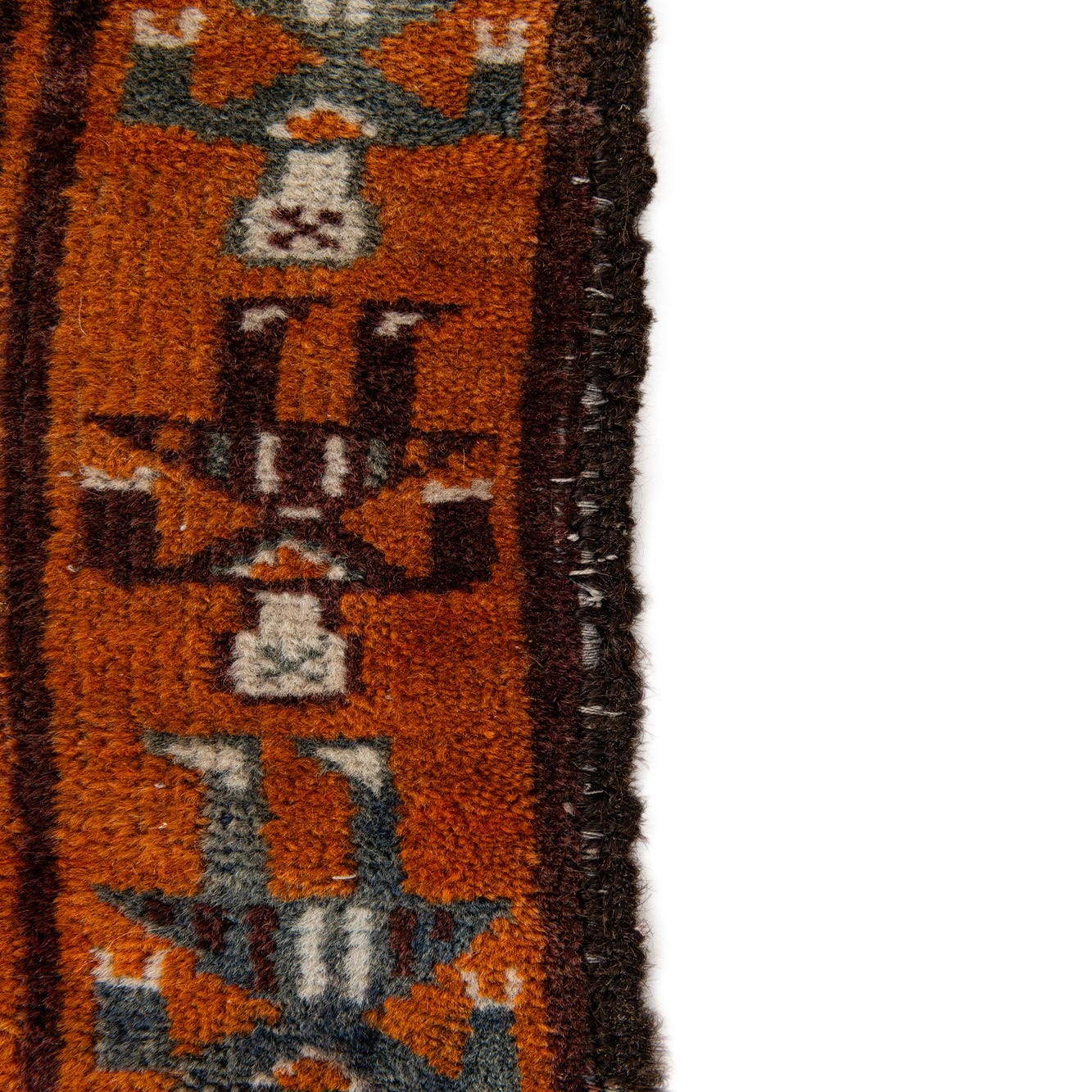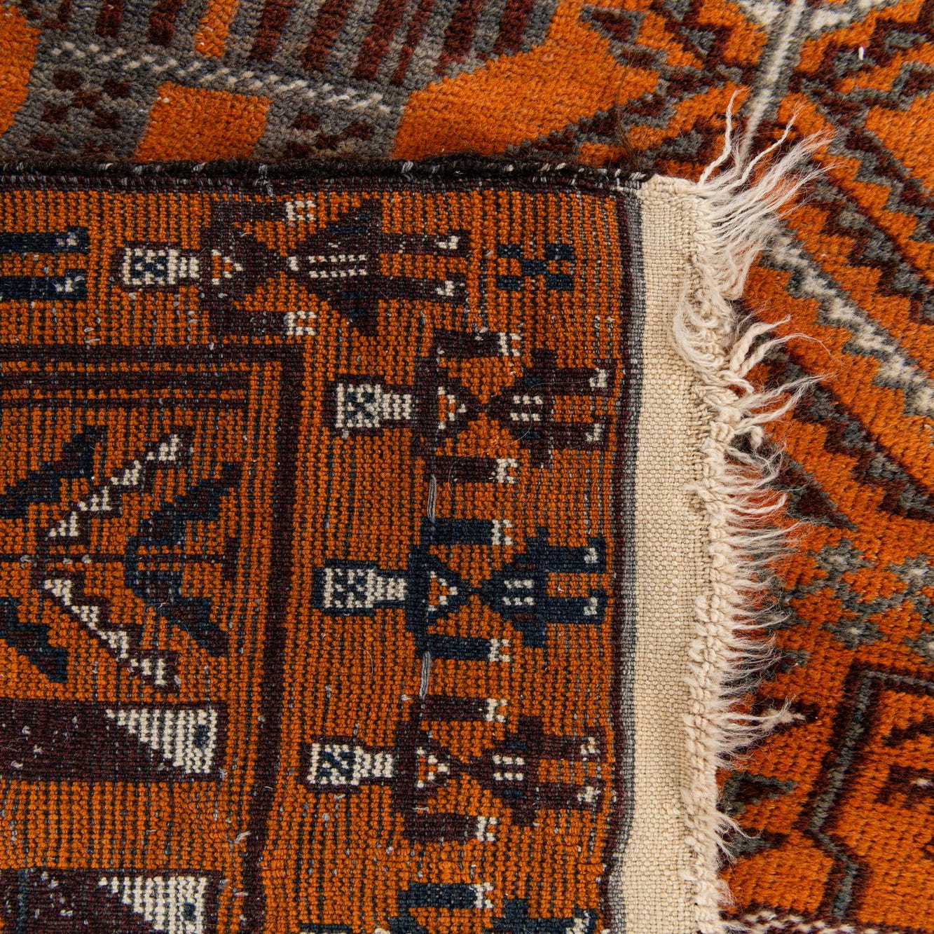 Primary color is Orange. Colors in this rug include: Orange, Burgundy, Ivory, Navy Blue.