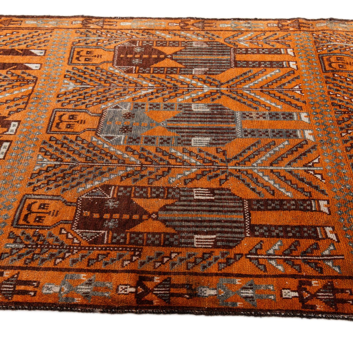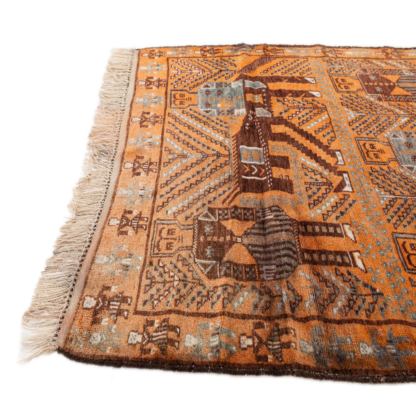 A 4x6 rectangular Afghan Ersari rug featuring a tribal pattern in shades of orange, brown, and blue, with fringe.