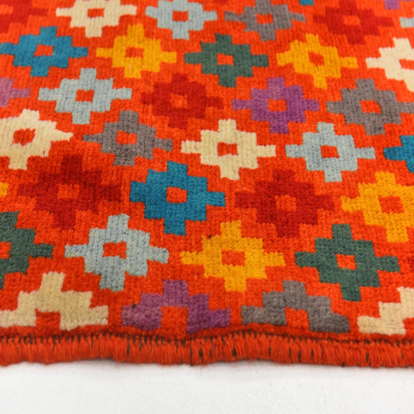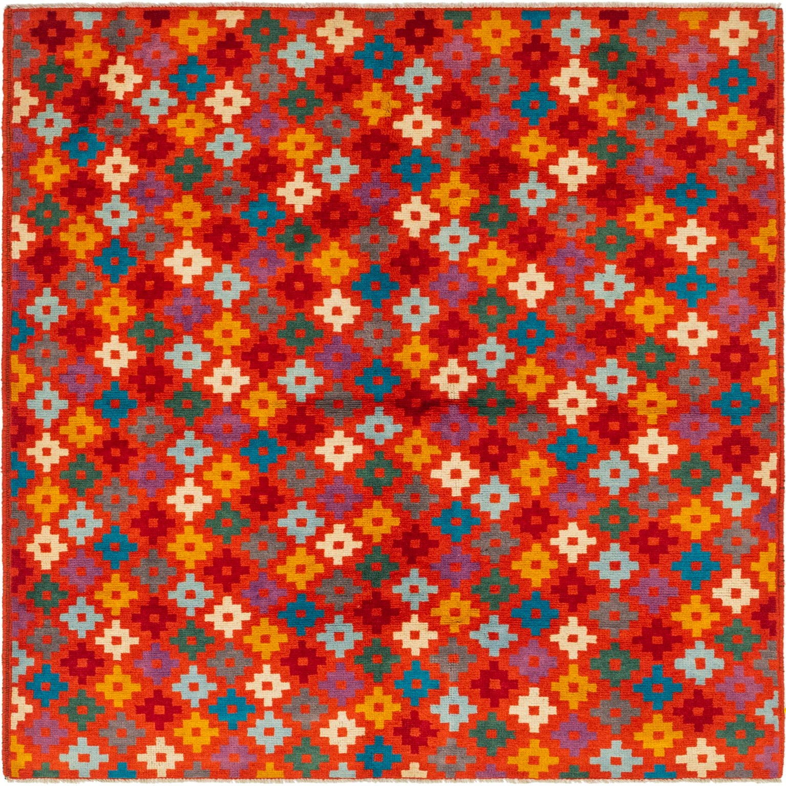 The Balouch collection presents a 4x6 hand-knotted rug meticulously crafted from 100% wool, offering a tactile experience that is as pleasing to the touch as it is to the eye. The rug showcases a vivid orange background, embellished with a mosaic of geometric motifs in a harmonious palette that includes shades of blue, gold, gray, green, and red. The vibrant color scheme makes a bold statement yet is versatile enough to complement various home settings.