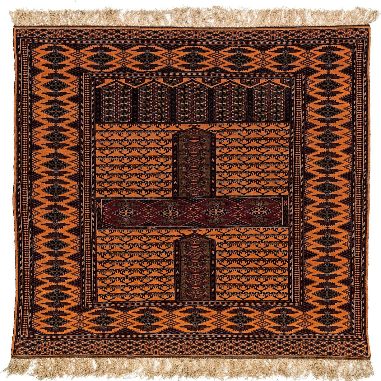 Primary color is Orange. Colors in this rug include: Orange, Black, Brown, Red.