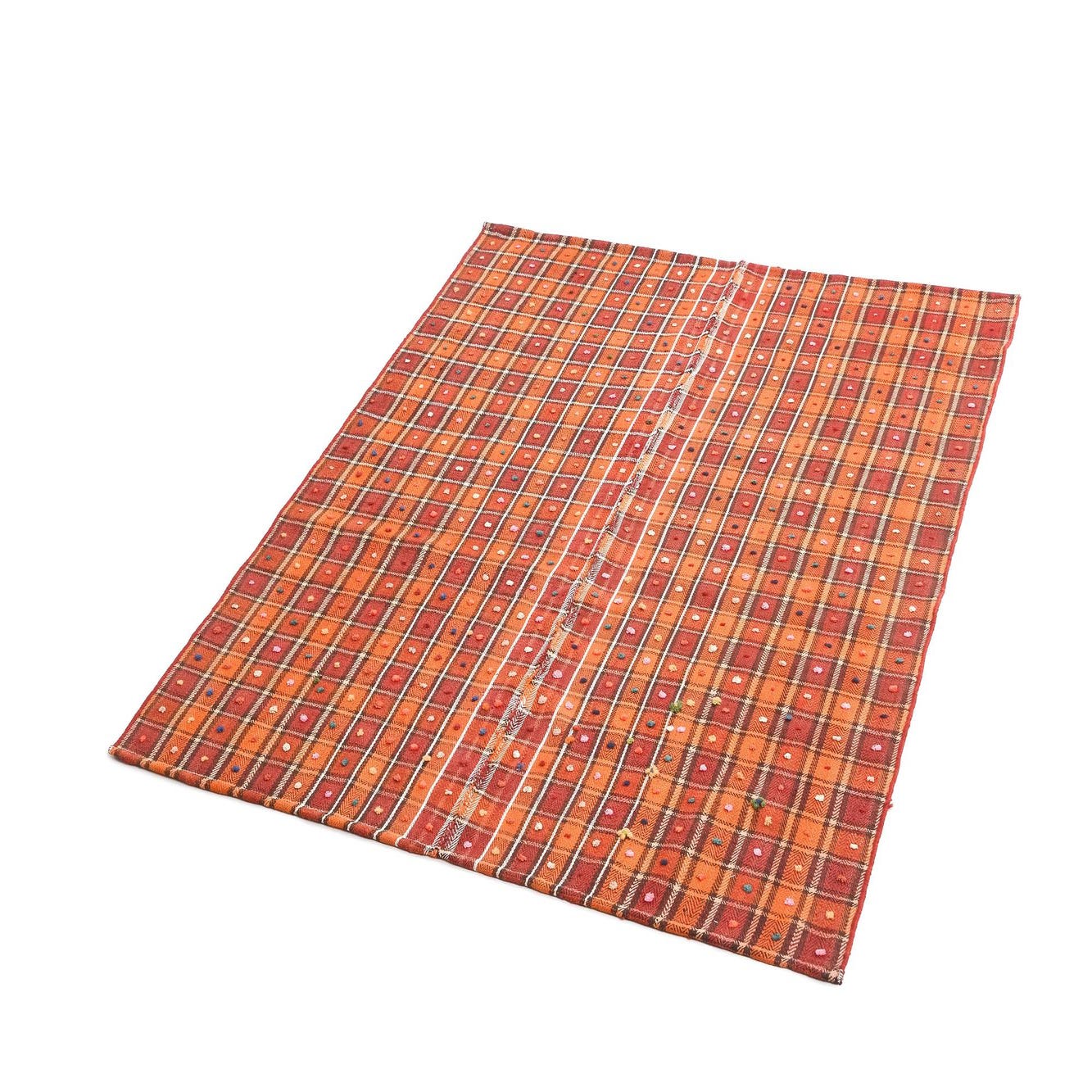 A 4x6 rectangular Jajim Persian rug featuring an orange and brown plaid pattern with colorful dots.