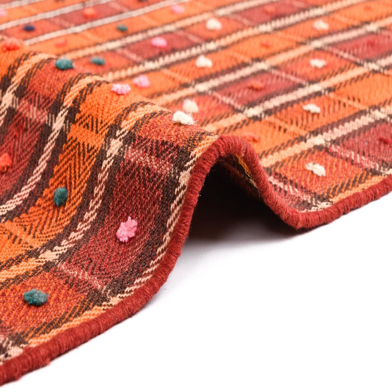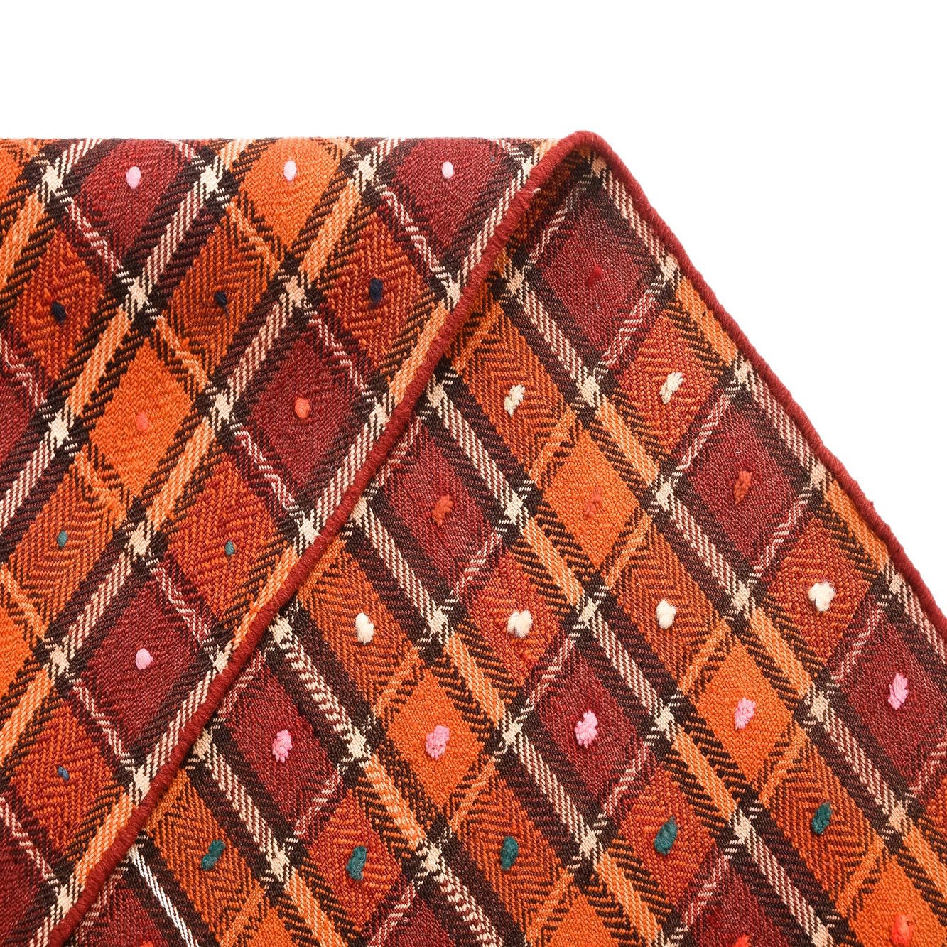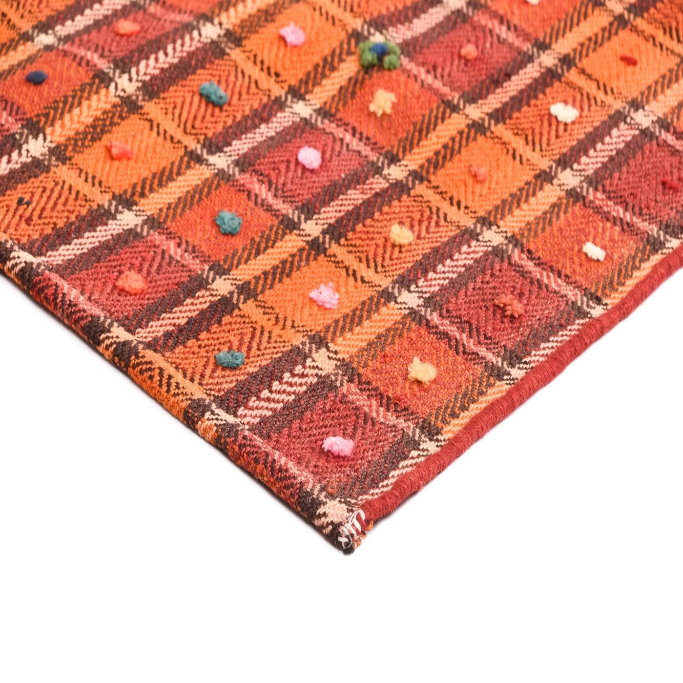 This hand-made Jajim rug anchors the room with its warm orange background, detailed by a grid of intersecting white lines that create a distinctive checkered pattern. The wool construction promises a durable and tactile addition to any space. Punctuating the checked design, a variety of small, multicolored dots adds a playful, artisanal charm to the rug's overall aesthetics.