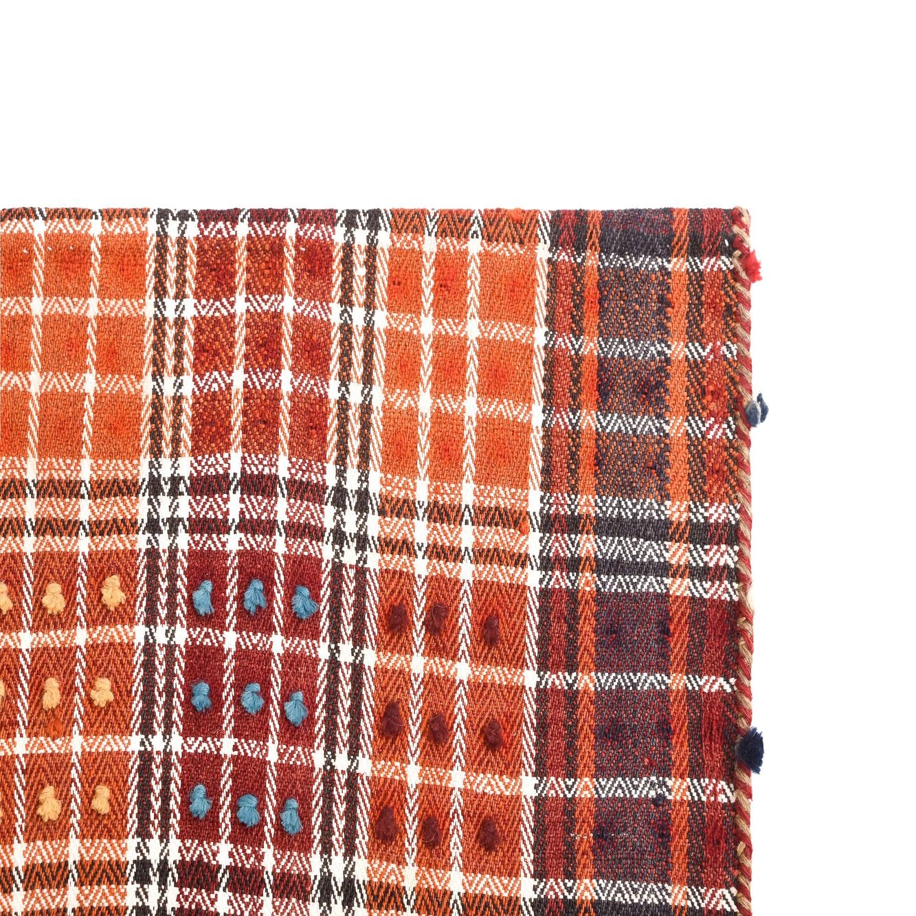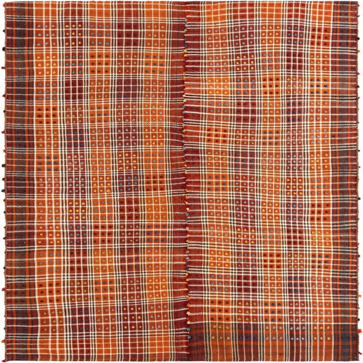 A 4x6 rectangular Jajim rug in shades of orange and red with a plaid pattern and small colorful dots, handmade from wool.