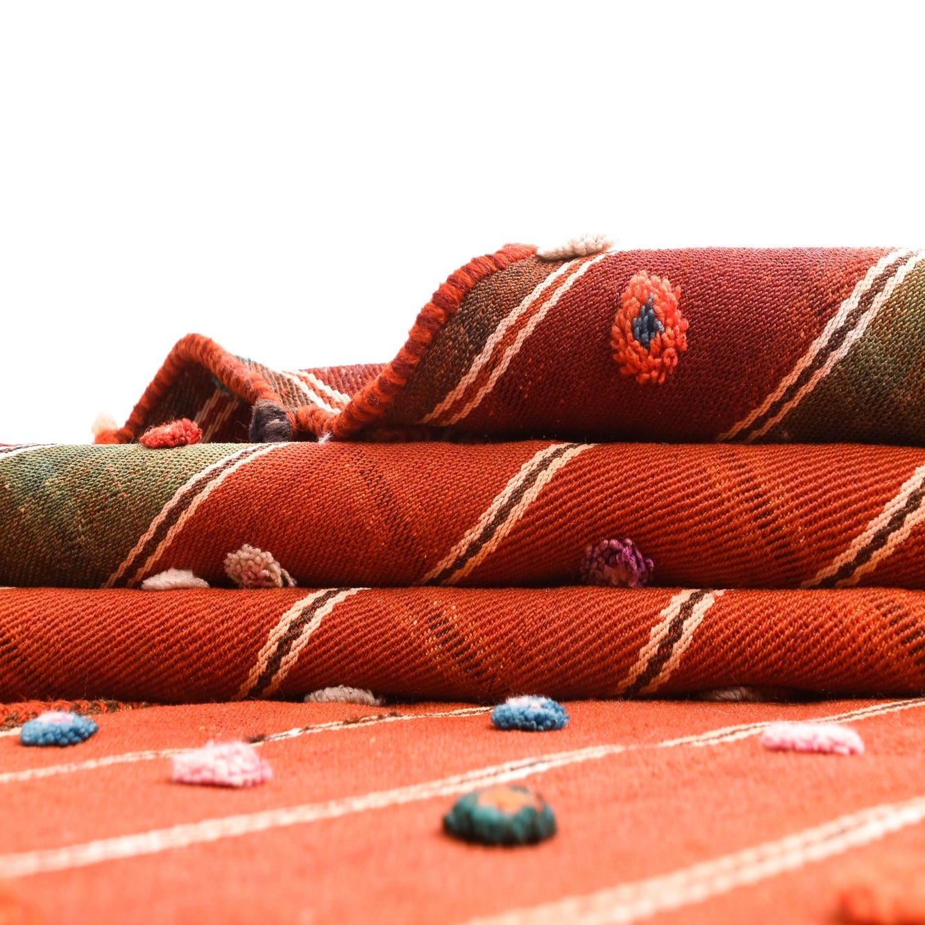 A 4x6 rectangular Jajim Persian wool rug featuring a warm orange base with vertical white and yellow stripes, accented by colorful polka-dot-like tufts and green border stripes.