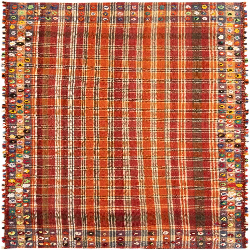 A 4x6 rectangular Jajim rug featuring a vibrant orange plaid pattern with colorful, textured bobble borders.