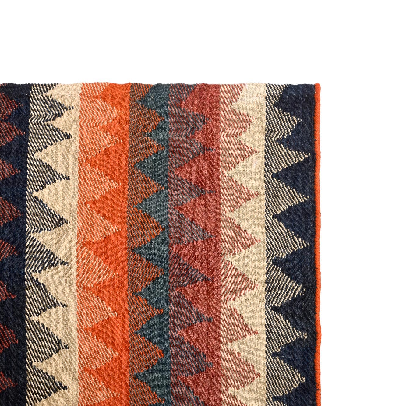 A 4x6 rectangular orange Persian Jajim rug with striped patterns in various shades of orange, blue, and cream.