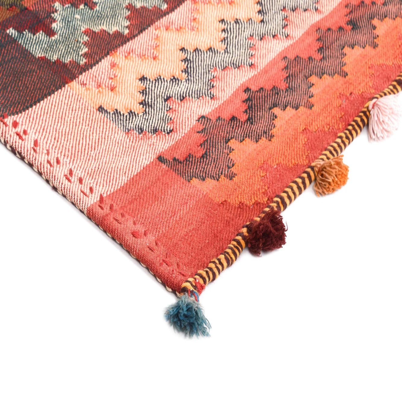 A 4x6 rectangular Jajim wool rug featuring vibrant orange, red, and brown stripes with zig-zag patterns and colorful pom-pom tassels.