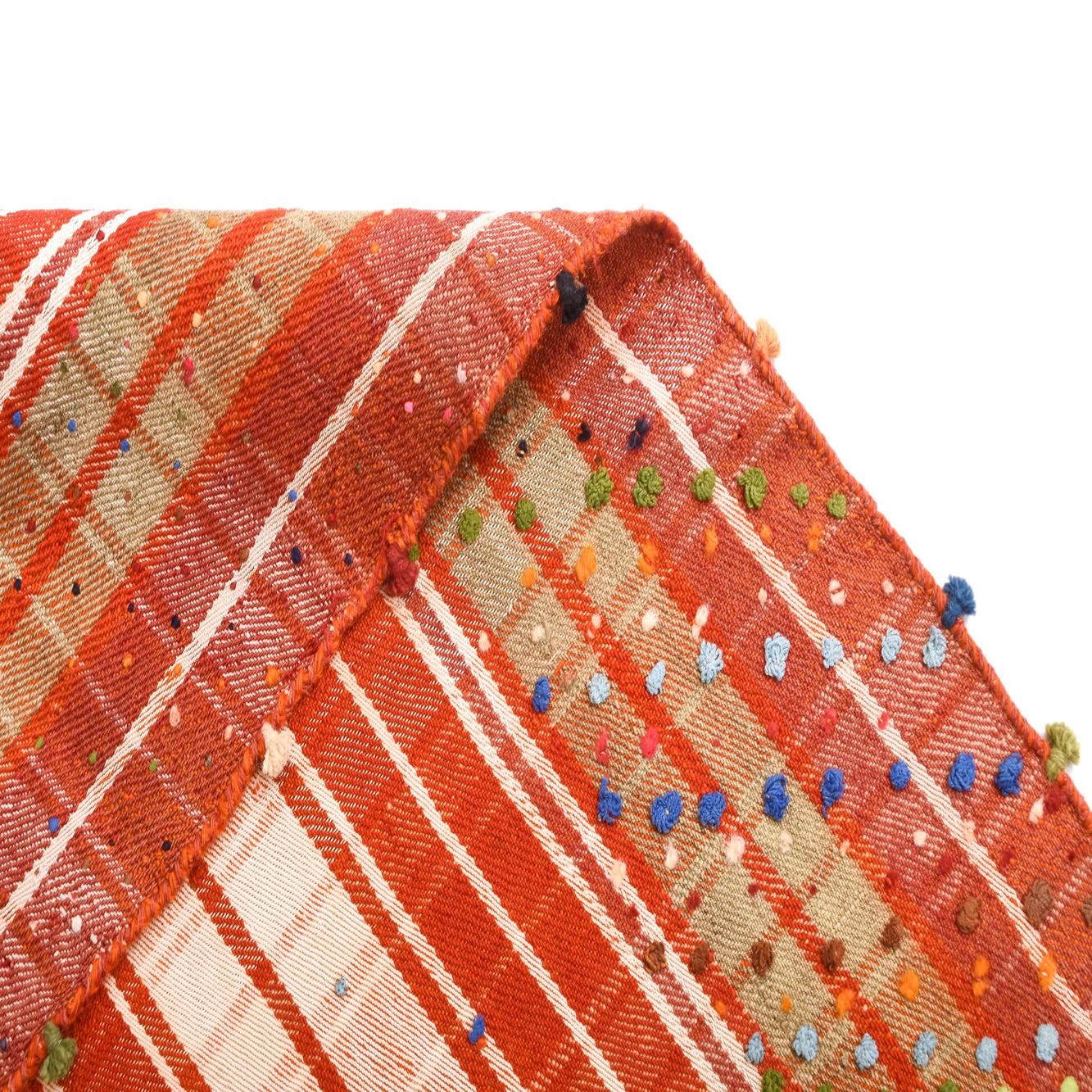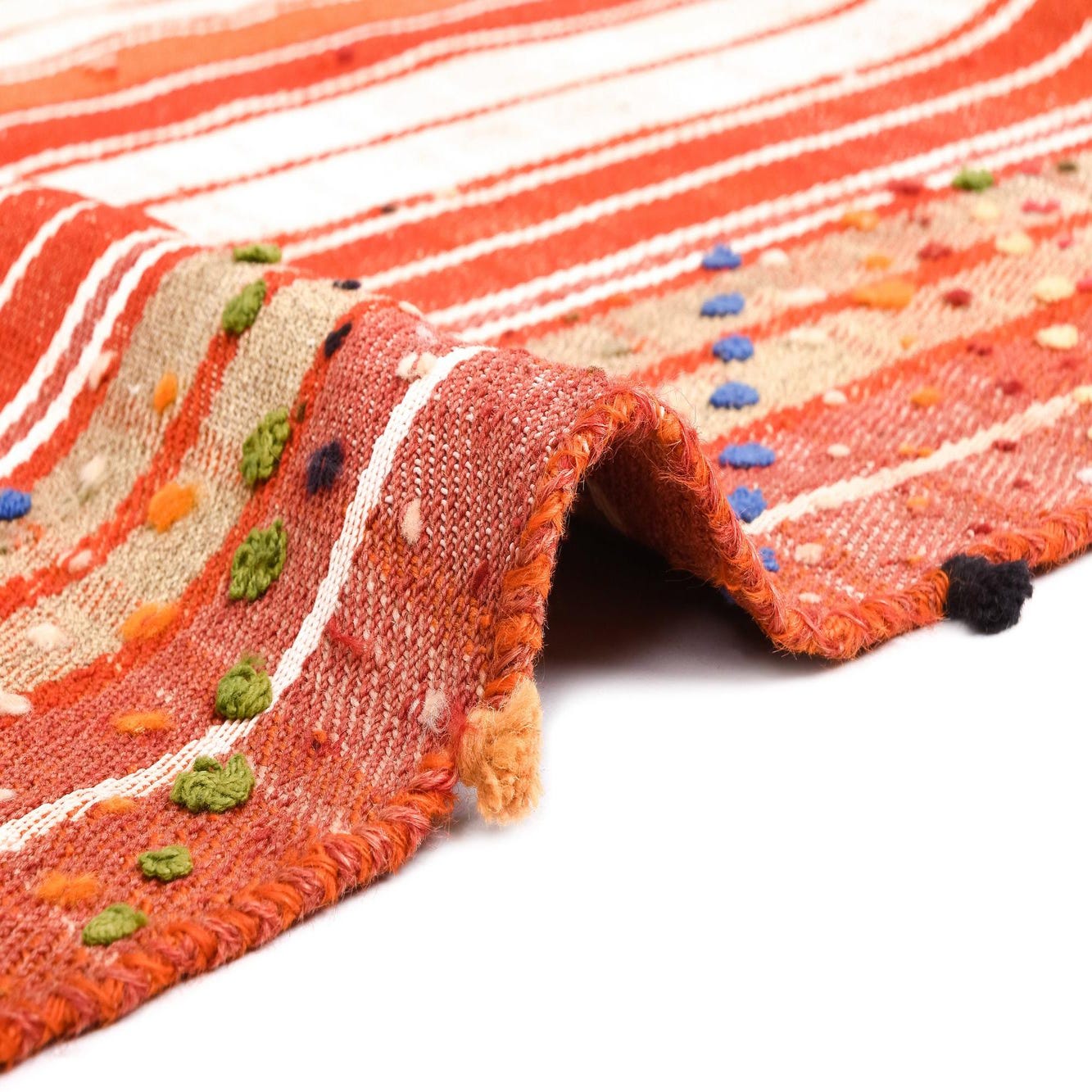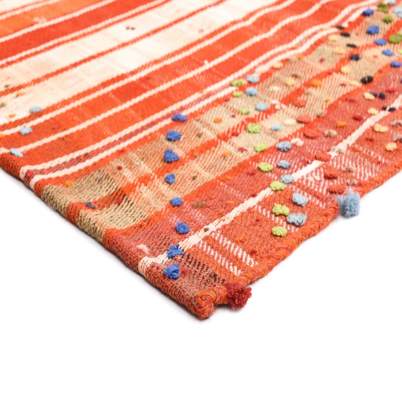 Warm, handwoven wool stripes form the backbone of this Jajim-style rug with a lively, tactile presence. Broad bands of orange alternate with cream and narrower white pinstripes, producing a clean vertical rhythm across the field. Along the edges, denser stripes in earthy tones are punctuated by tiny, multicolored knots and tufts that add playful specks of blue, green, pink and yellow without overpowering the overall design. The hand-made construction yields subtle irregularities in the weave and finishing, giving the piece character and a handcrafted look.