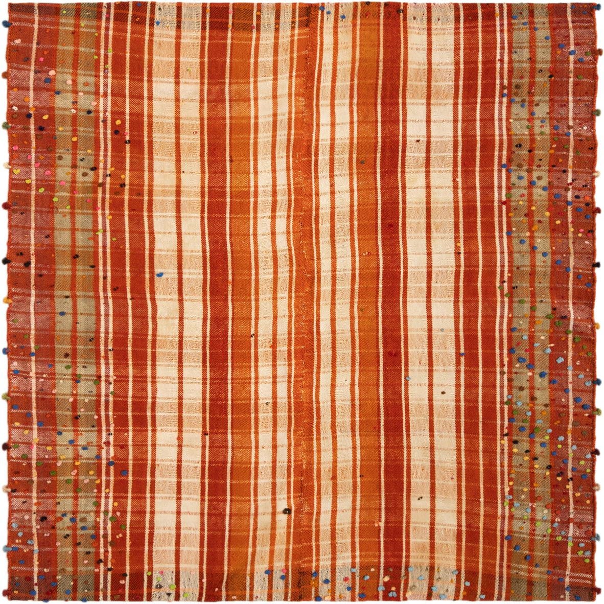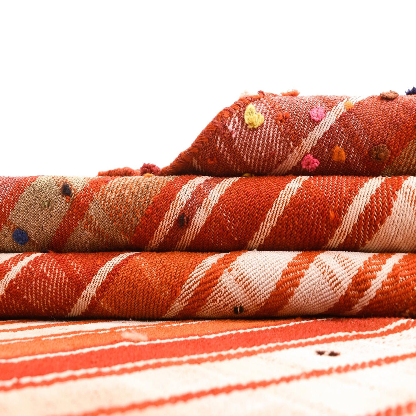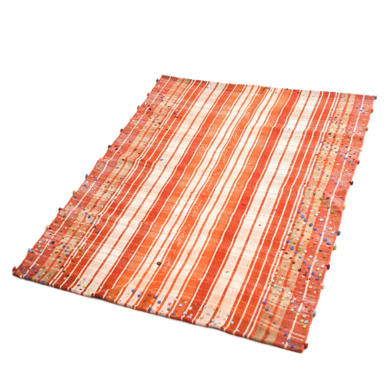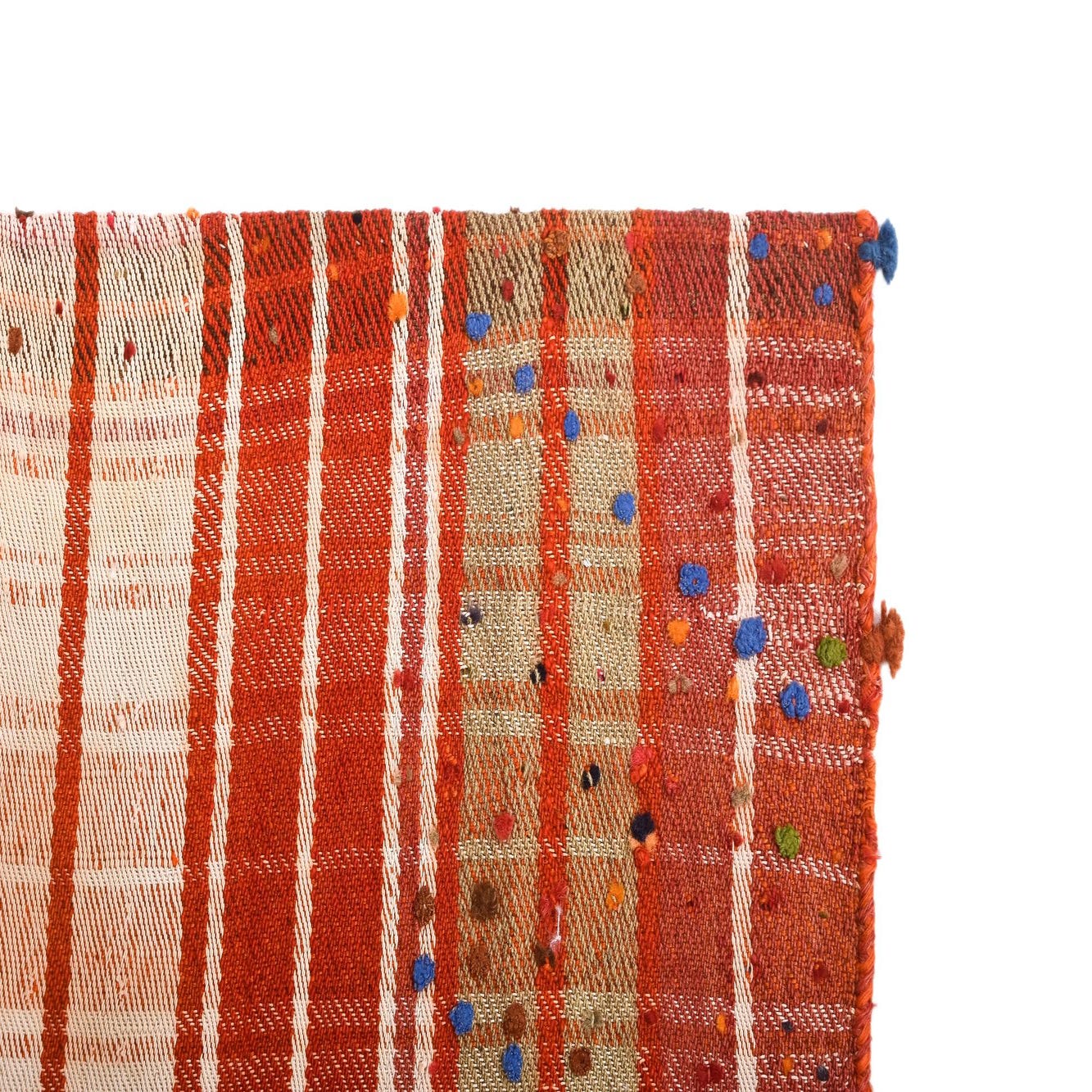 Warm, handwoven wool stripes form the backbone of this Jajim-style rug with a lively, tactile presence. Broad bands of orange alternate with cream and narrower white pinstripes, producing a clean vertical rhythm across the field. Along the edges, denser stripes in earthy tones are punctuated by tiny, multicolored knots and tufts that add playful specks of blue, green, pink and yellow without overpowering the overall design. The hand-made construction yields subtle irregularities in the weave and finishing, giving the piece character and a handcrafted look.