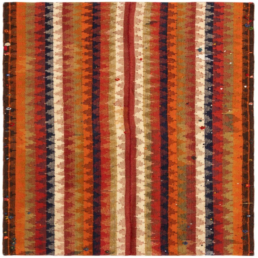 The Jajim collection presents a handcrafted wool rug in a size of 4x6, boasting a vibrant, orange background. This rug possesses a striking stripe pattern that showcases a harmonious blend of colors, including rich shades of brown, beige, black, and subtle hints of colorful accents. The texture is indicative of traditional woolen craftsmanship, offering a tactile experience that suggests durability and comfort underfoot.
