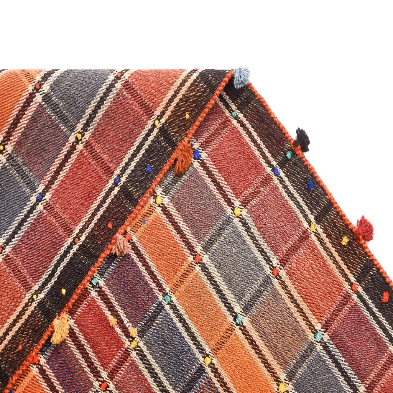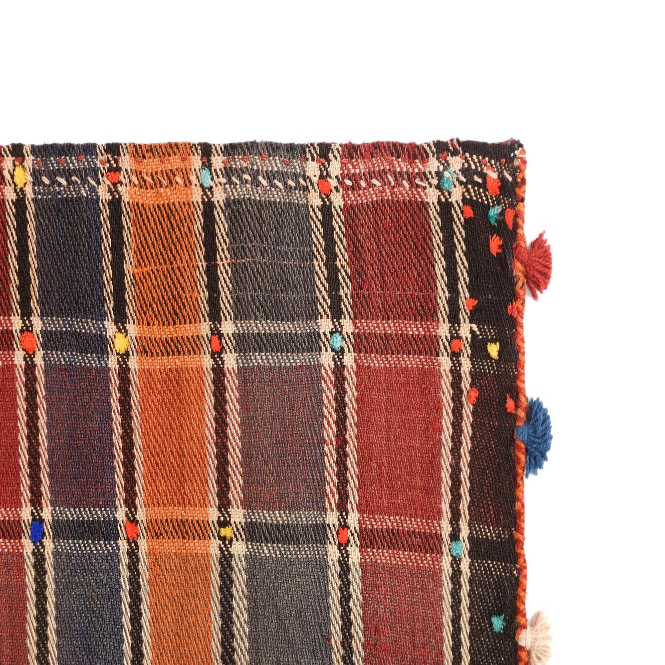 A 4x6 rectangular Jajim rug featuring a vibrant plaid pattern in oranges, blues, and reds with colorful pom-pom tassels along the edges.