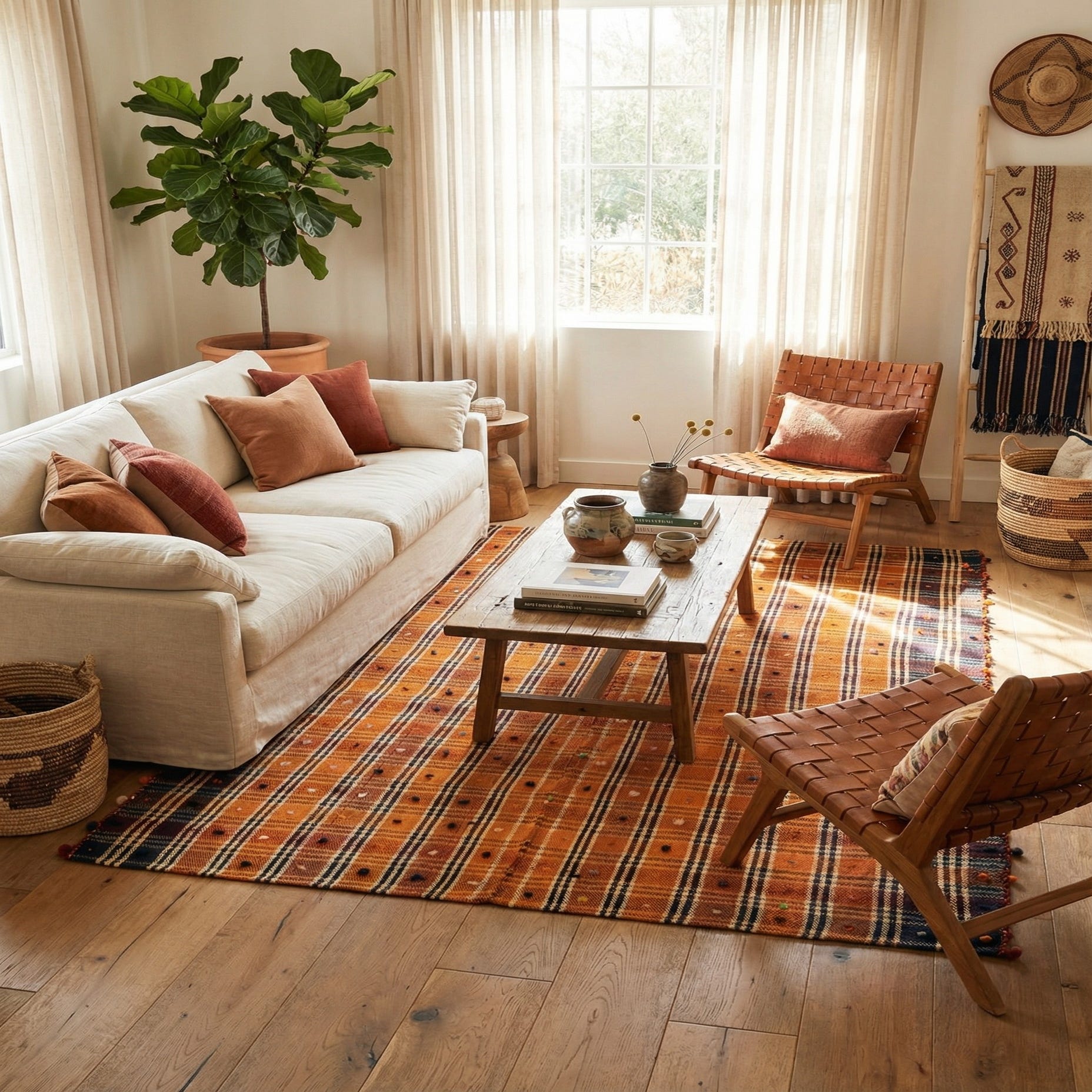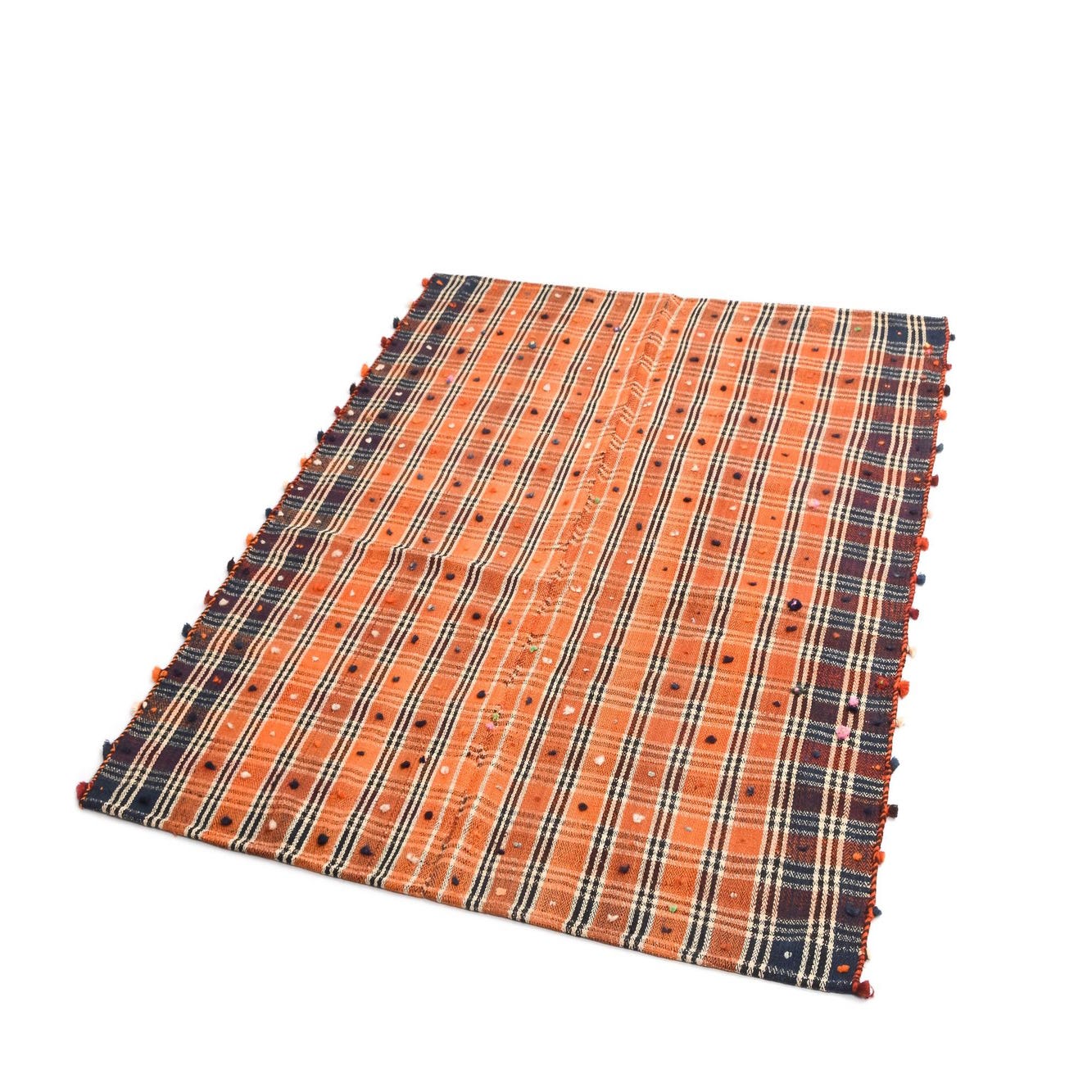 A 4x6 rectangular Jajim rug in warm orange and dark blue plaid, featuring colorful flecks and small pom-pom fringe.