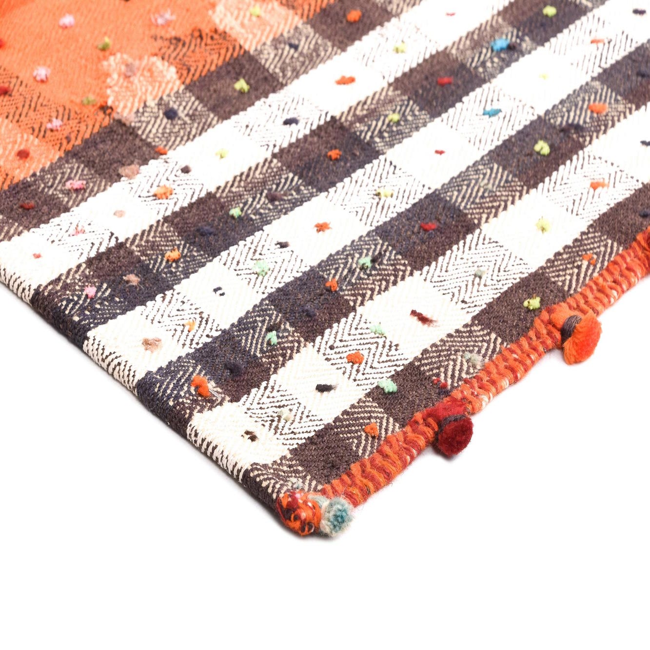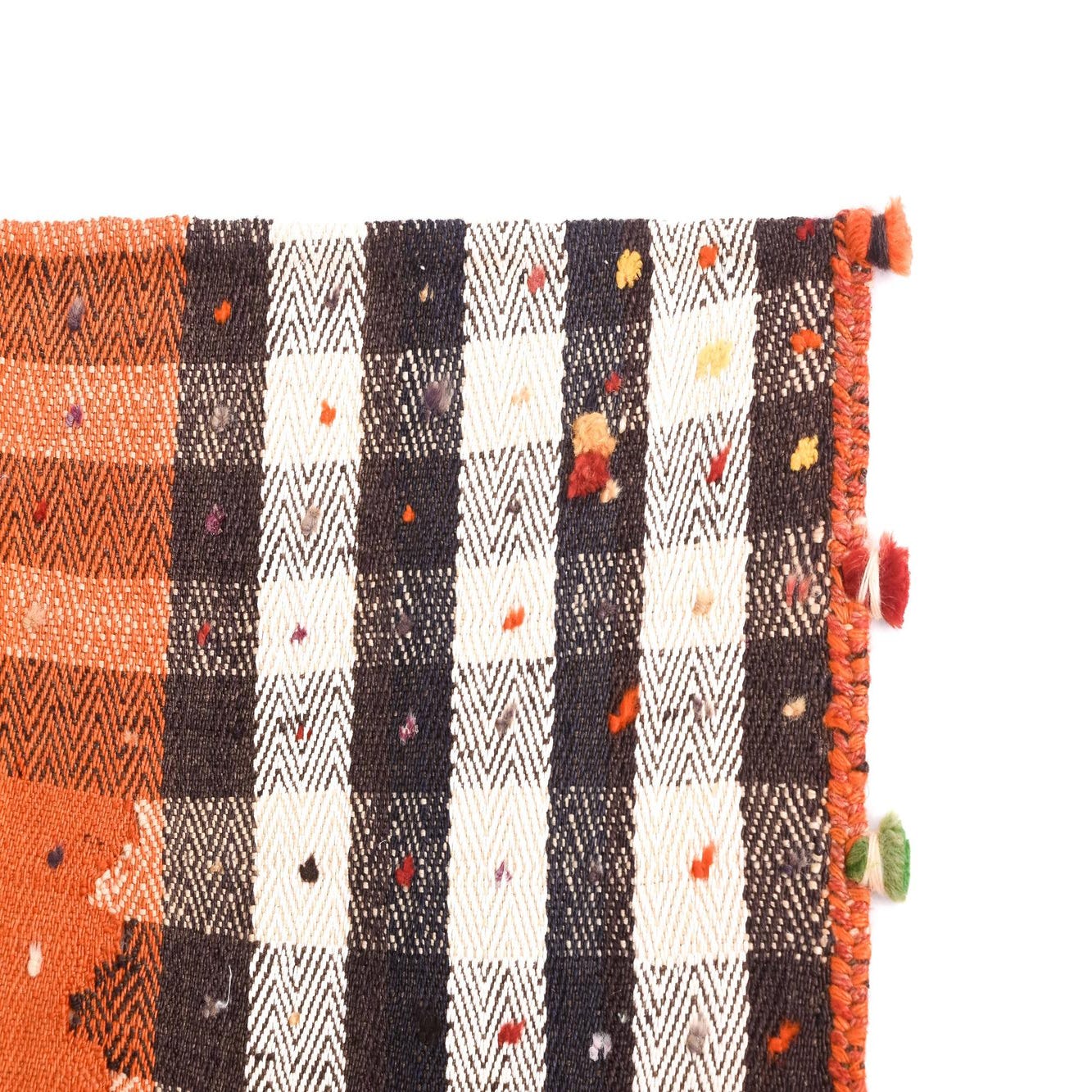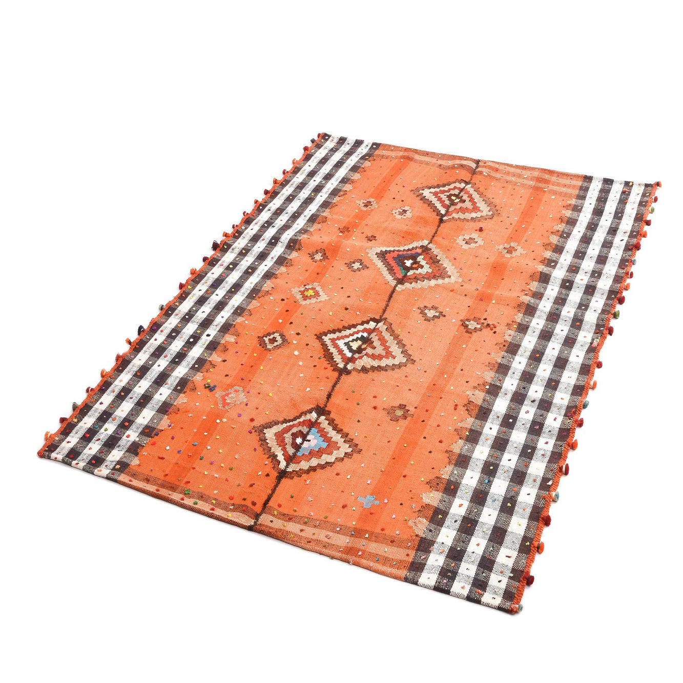 Handmade of wool, this flatwoven rug presents a warm orange field punctuated by a vertical run of stepped diamond medallions in cream, rust, brown and small pops of turquoise, mustard and red. A graphic black-and-cream checked border frames the composition, while tiny multicolored flecks scattered across the surface add lively, handmade detail. The weave feels low-profile and tactile underfoot, with a firm, slightly textured surface and subtle irregularities that give the piece character.