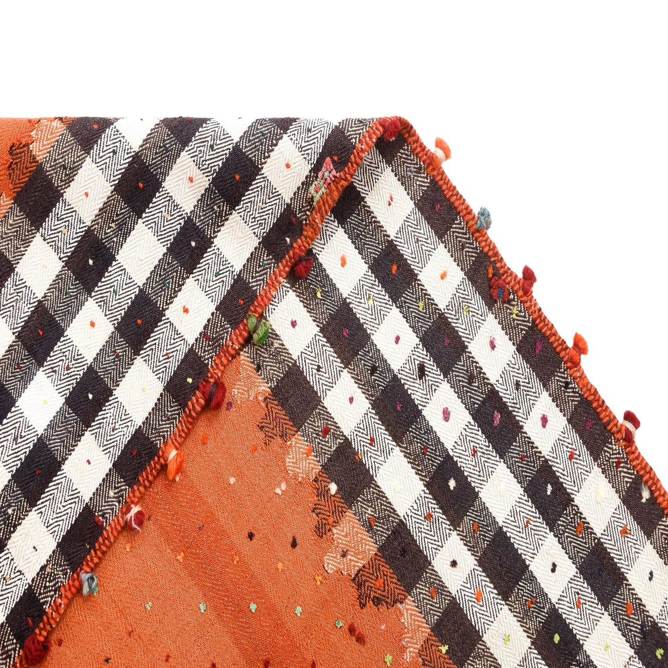 A 4x6 rectangular Jajim rug featuring a vibrant orange center with colorful geometric diamonds and black and white checkered borders.