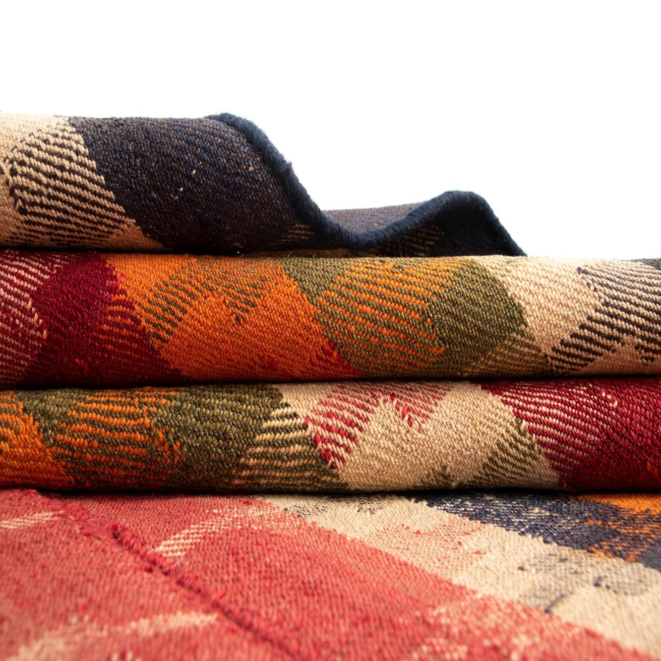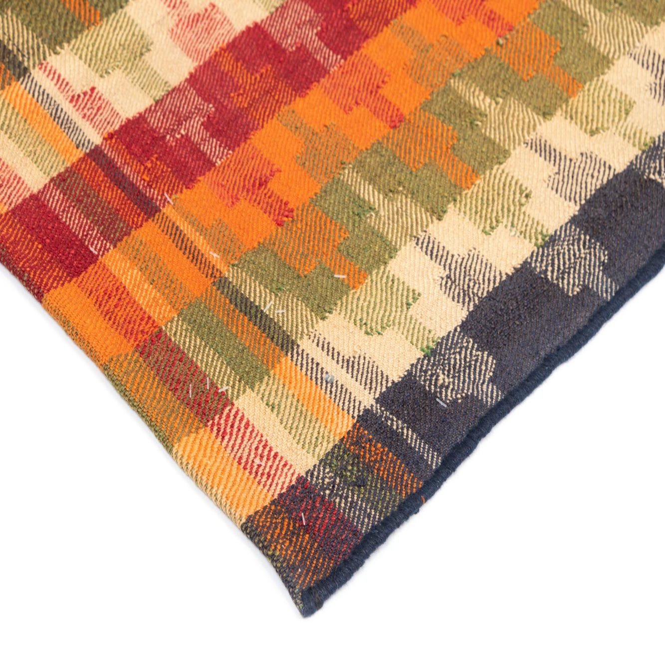Hand-made of 100% wool, this flat-woven Jajim-style rug pairs a graphic, houndstooth-inspired motif with strong vertical bands set against an orange ground. Stripes of rust red, olive green, navy and warm cream alternate with brighter orange and faded rose highlights, creating a steady, geometric rhythm across the field. The colorway reads warm and grounded while the repeating small-scale pattern keeps the look lively and structured.