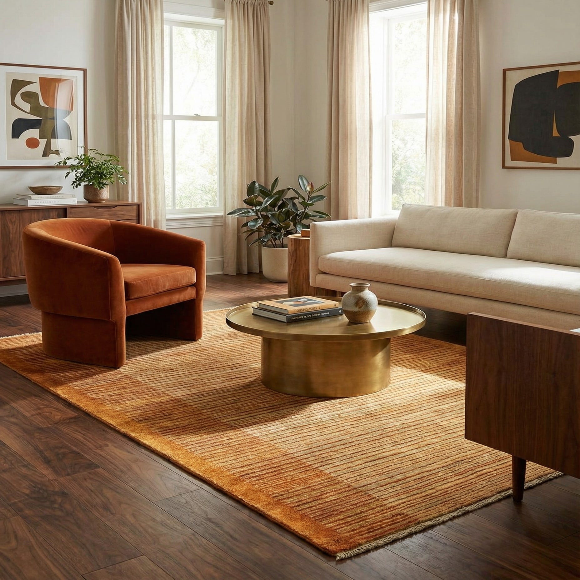 A 4x6 rectangular Juma Persian wool rug in varying shades of orange with horizontal stripes and a solid border.