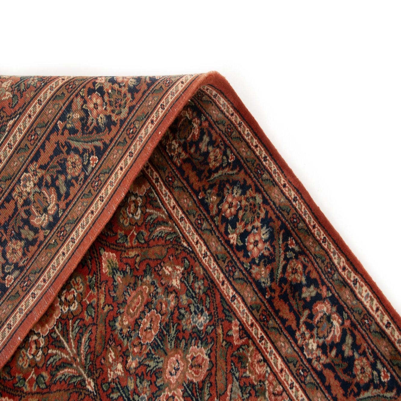 A 4x6 rectangular handmade wool rug featuring a traditional floral pattern in shades of orange, red, and navy.