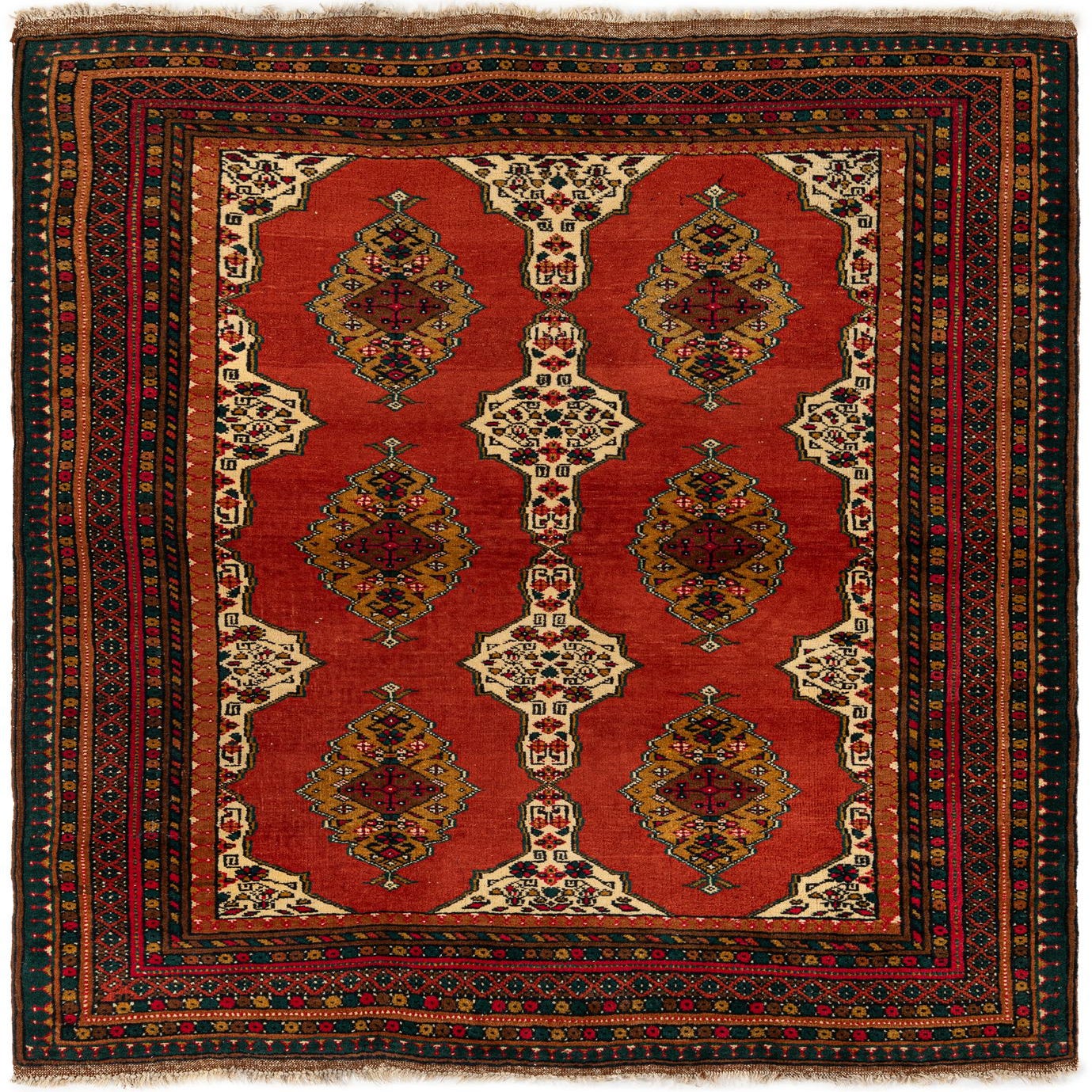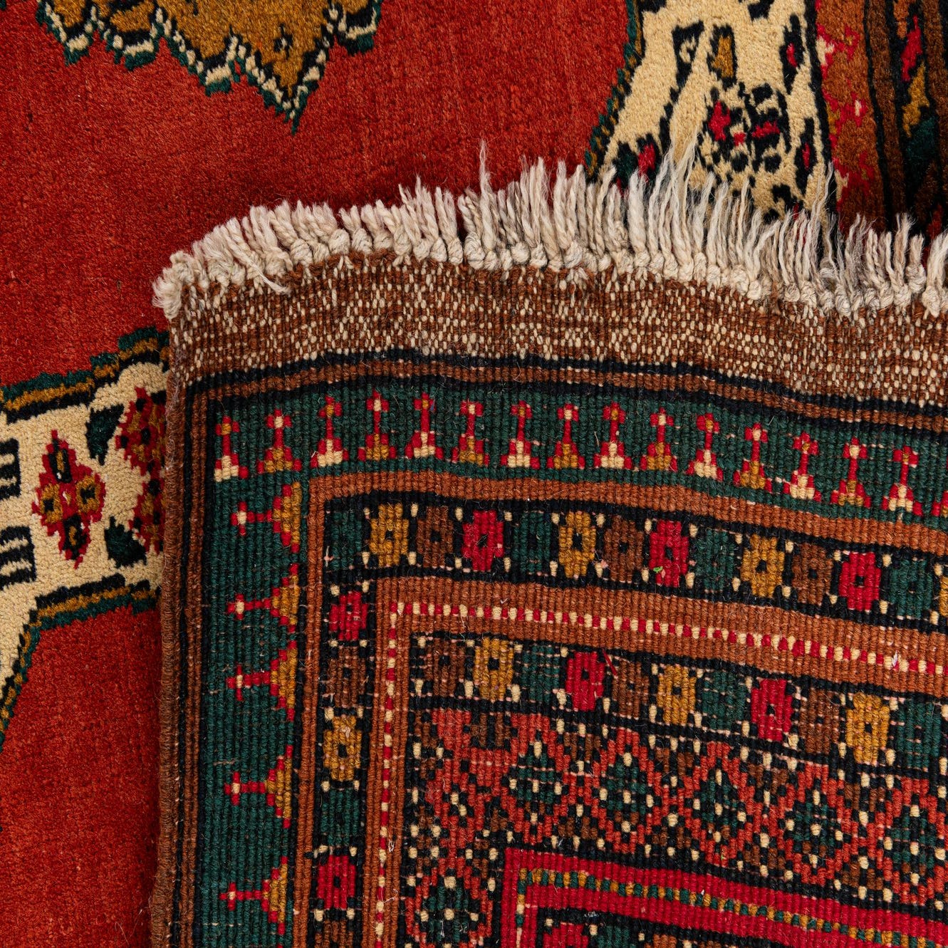 Primary color is Orange. Colors in this rug include: Orange, Beige, Black, Blue, Brown, Green, Yellow, Red, Ivory.