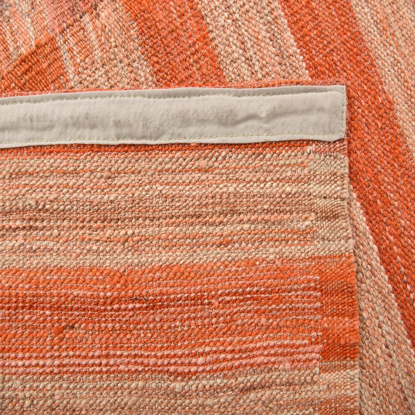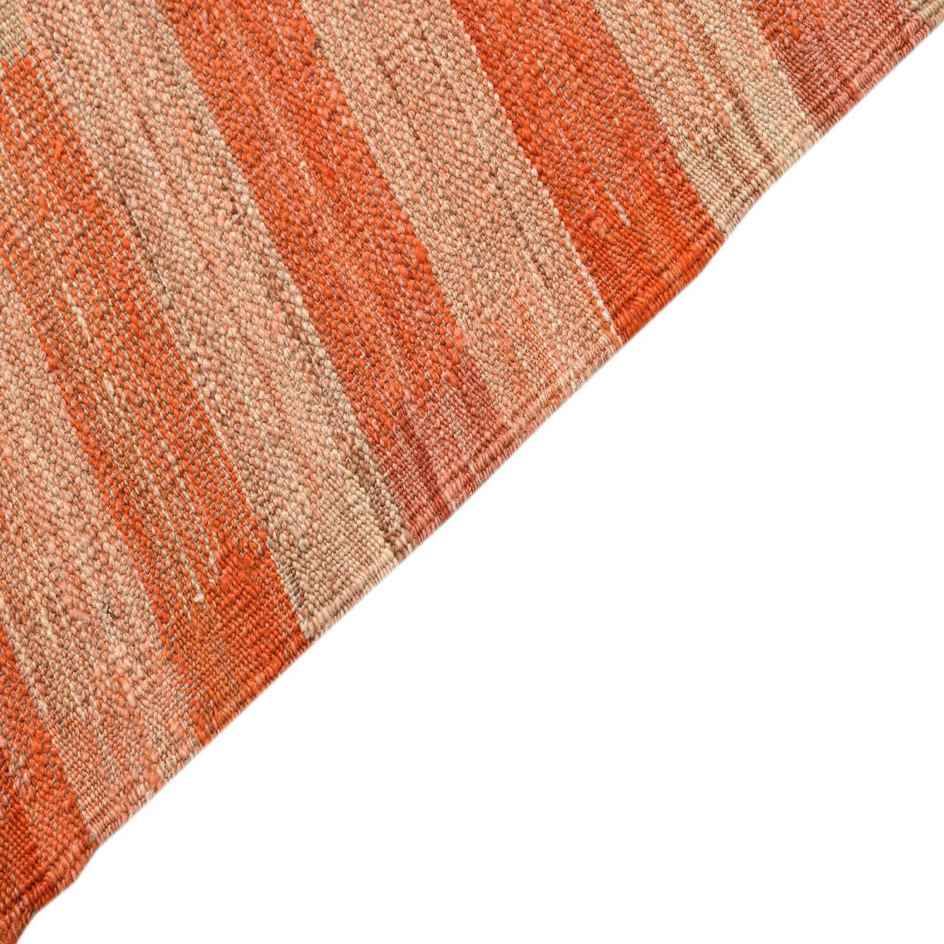 The Kilim Modern collection offers this hand-woven 4x6 area rug, crafted from 100% wool, showcasing a robust orange background with nuanced stripes in light salmon. The visual texture is enhanced by the natural variations in the wool fibers, lending a subtle, organic feel to the distinct horizontal patterning.
