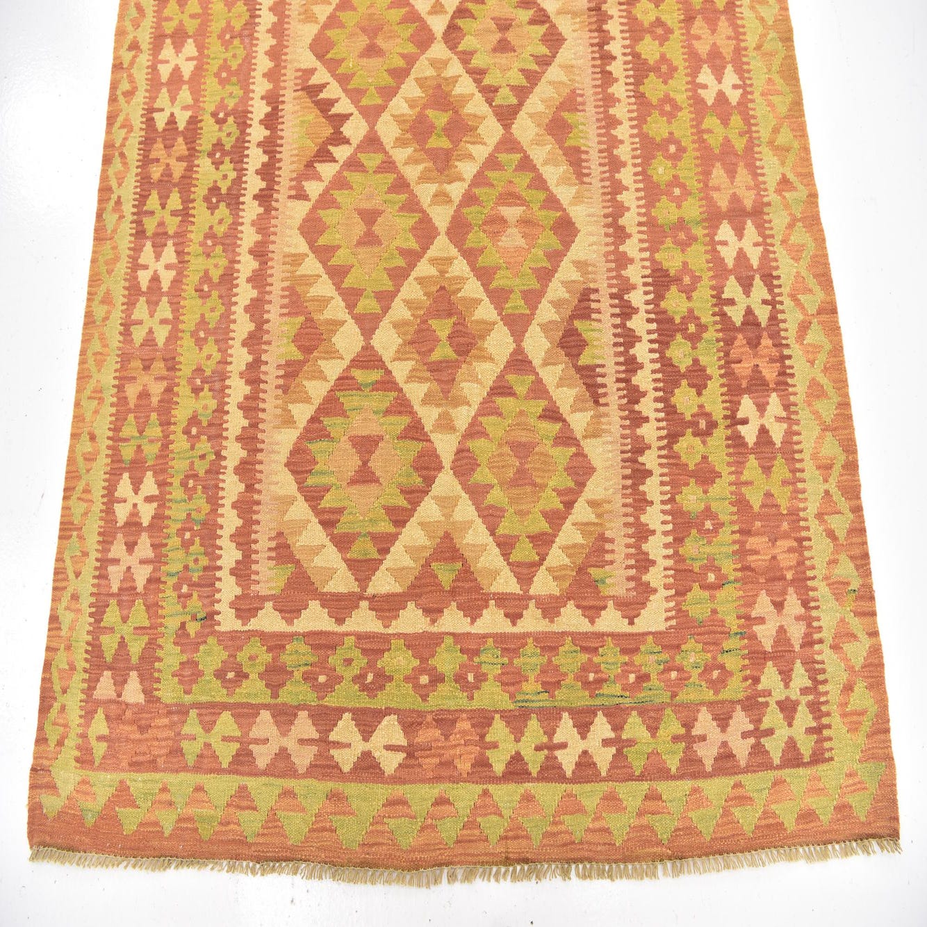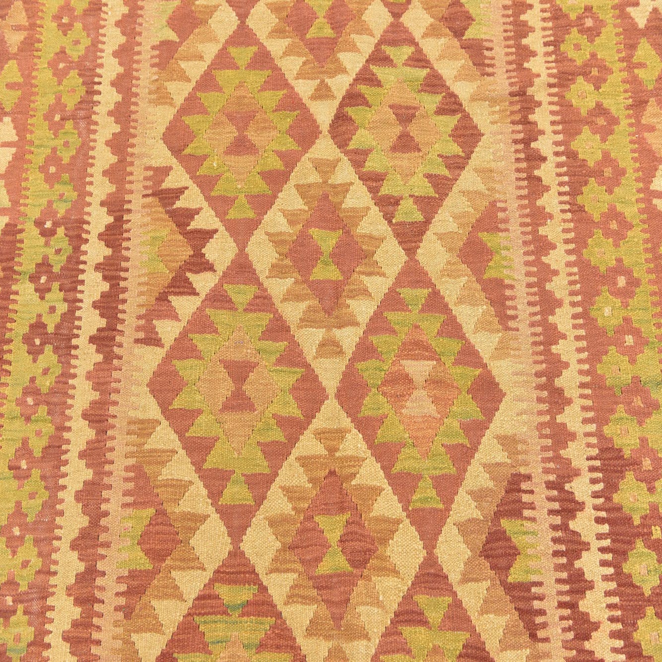 Ideal for adding a warm, cultural touch to any interior, this Kilim Waziri rug would be especially well-suited for spaces that celebrate artisanal and bohemian styles. Its earthy color scheme and distinctive pattern work seamlessly with natural wood furniture, and its rich texture can complement a minimalist decor to inject character and warmth. In a contemporary setting, the rug could serve as a statement piece, balancing modern furnishings with traditional craftsmanship.