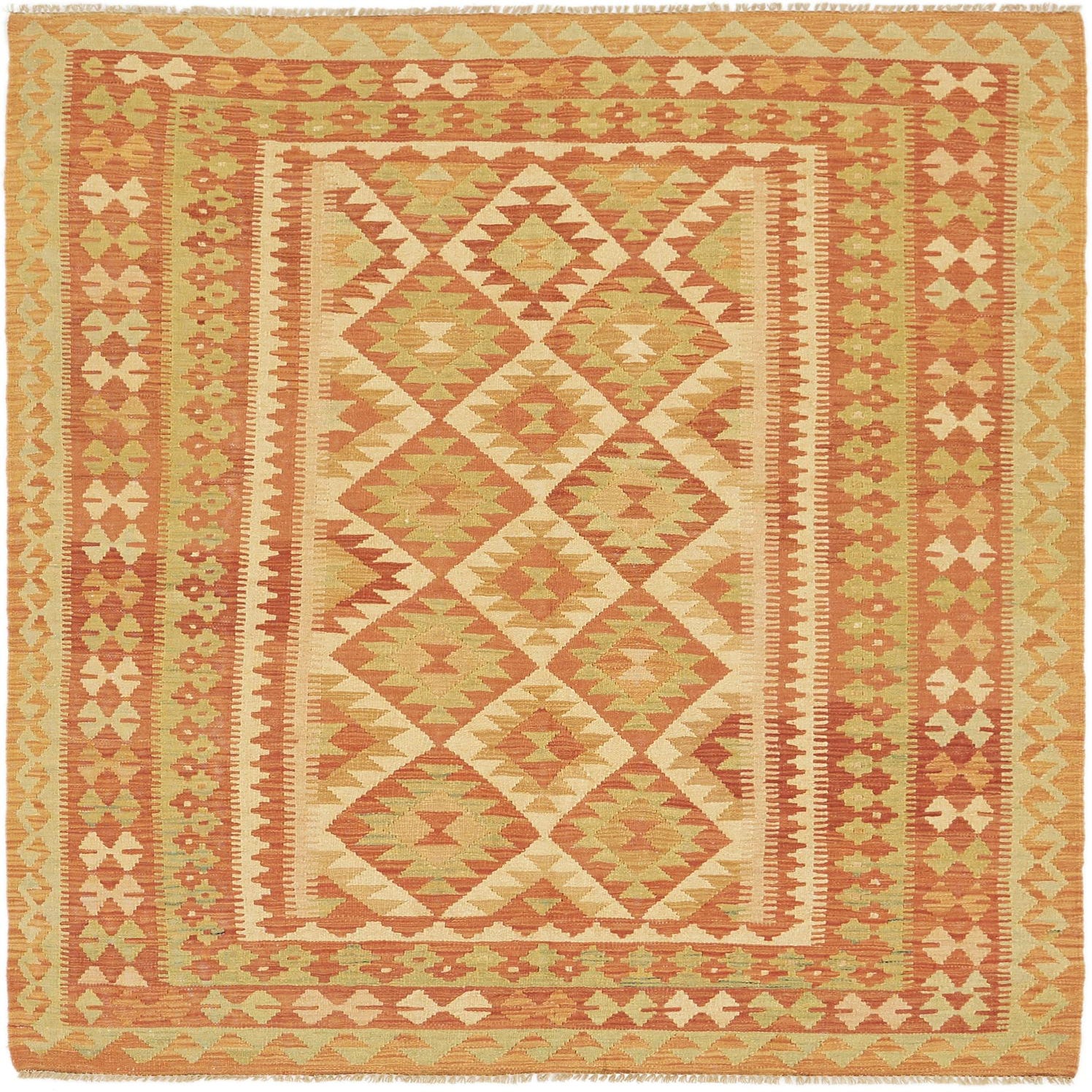 A 4x6 rectangular Kilim Waziri rug featuring traditional tribal patterns in various shades of orange and tan.