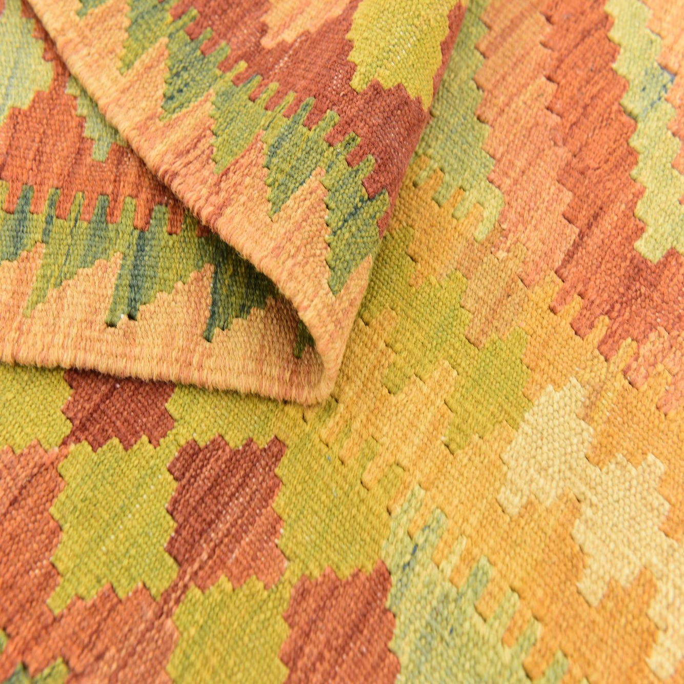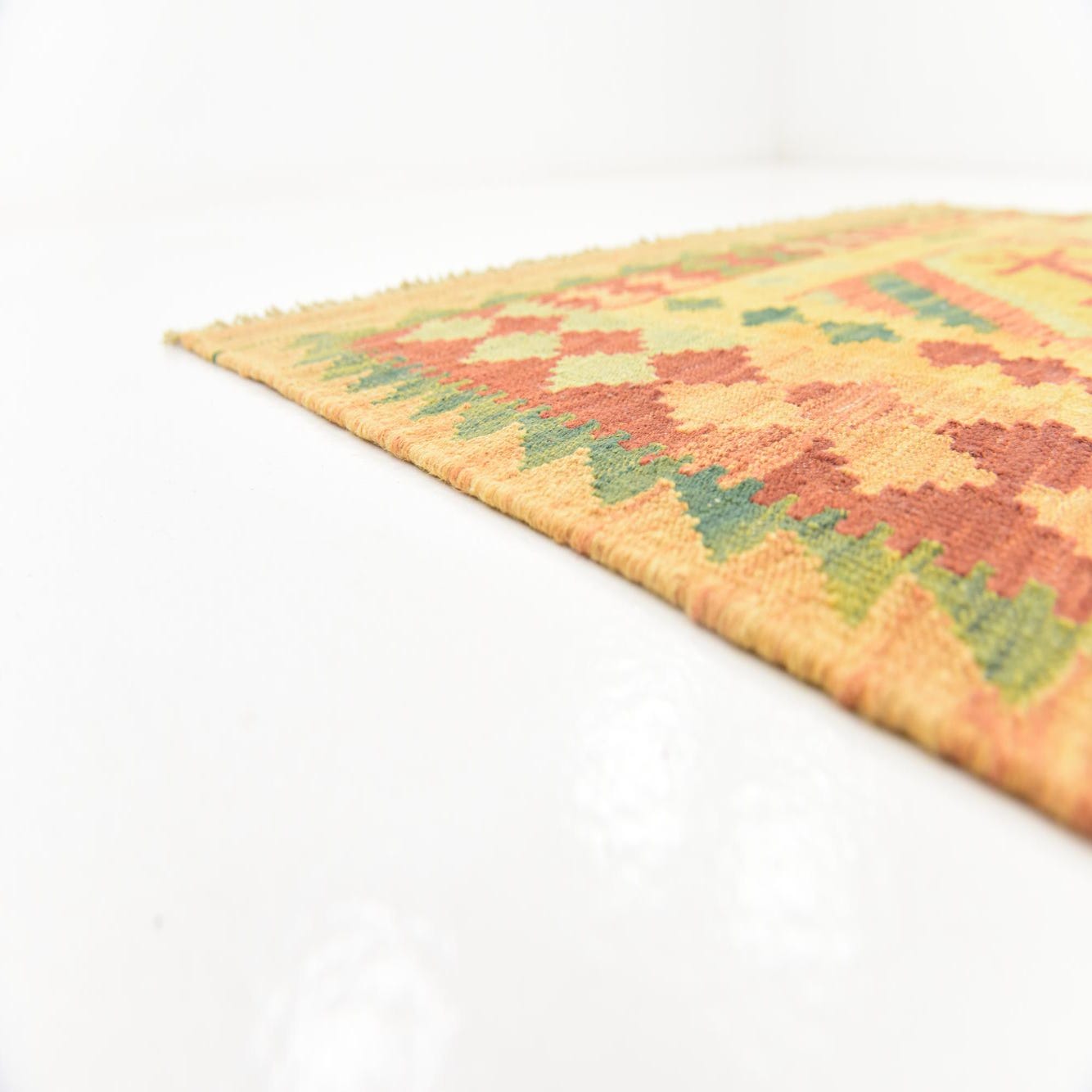 A 4x6 rectangular Kilim Waziri rug featuring a traditional tribal pattern in shades of orange, green, and yellow.
