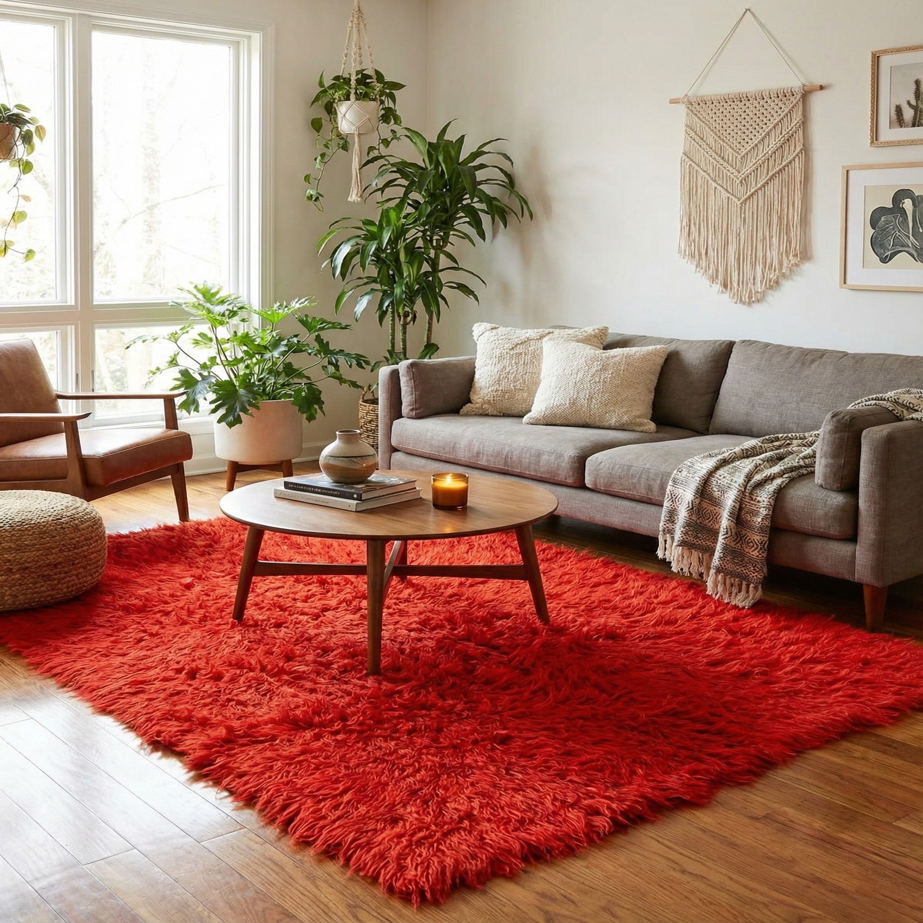 A vibrant 4x6 rectangular orange shag rug, handmade from wool, adds a bold modern touch to any indoor space.