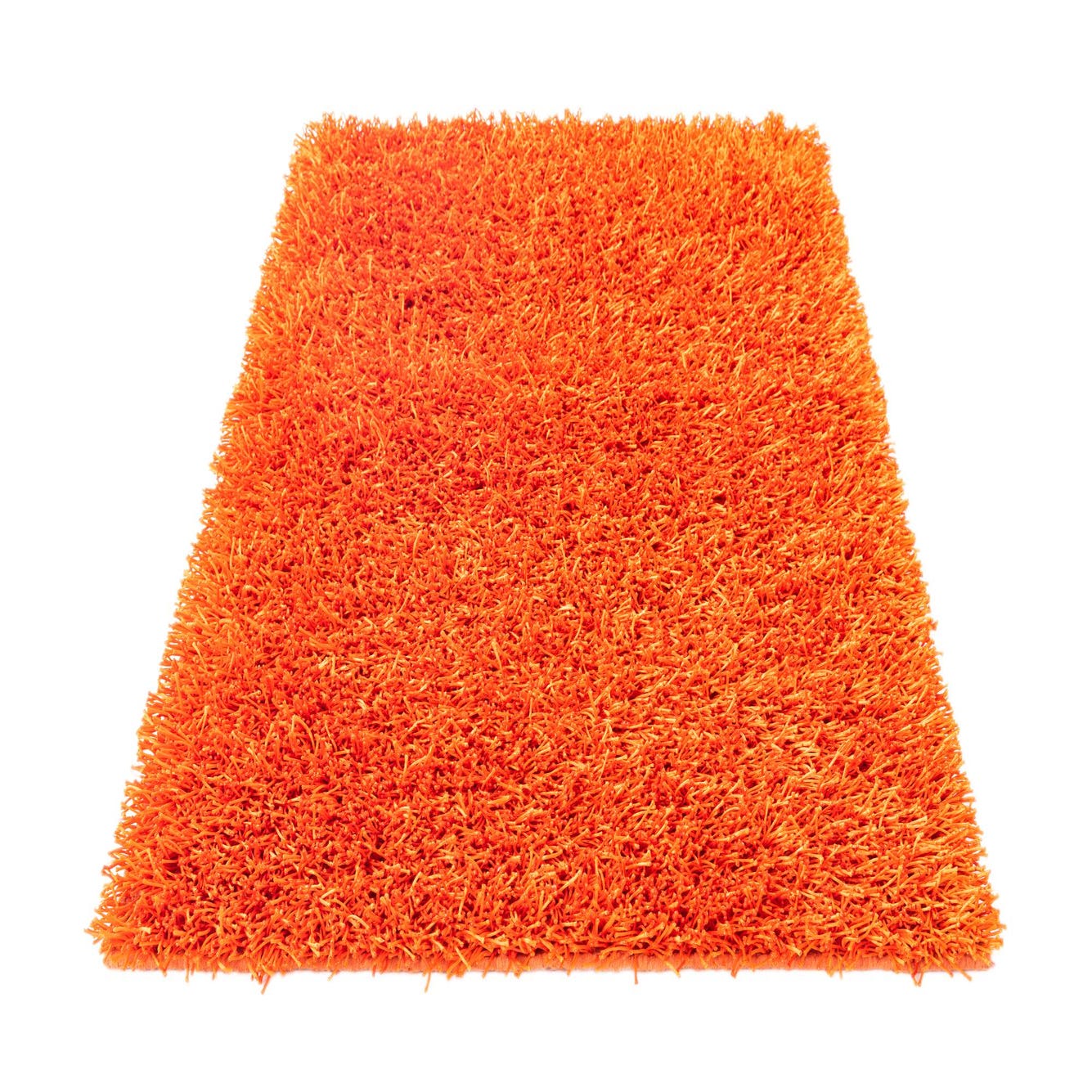 A vibrant 4x6 rectangular orange shag rug with a plush, textured pile, perfect for a modern living room.