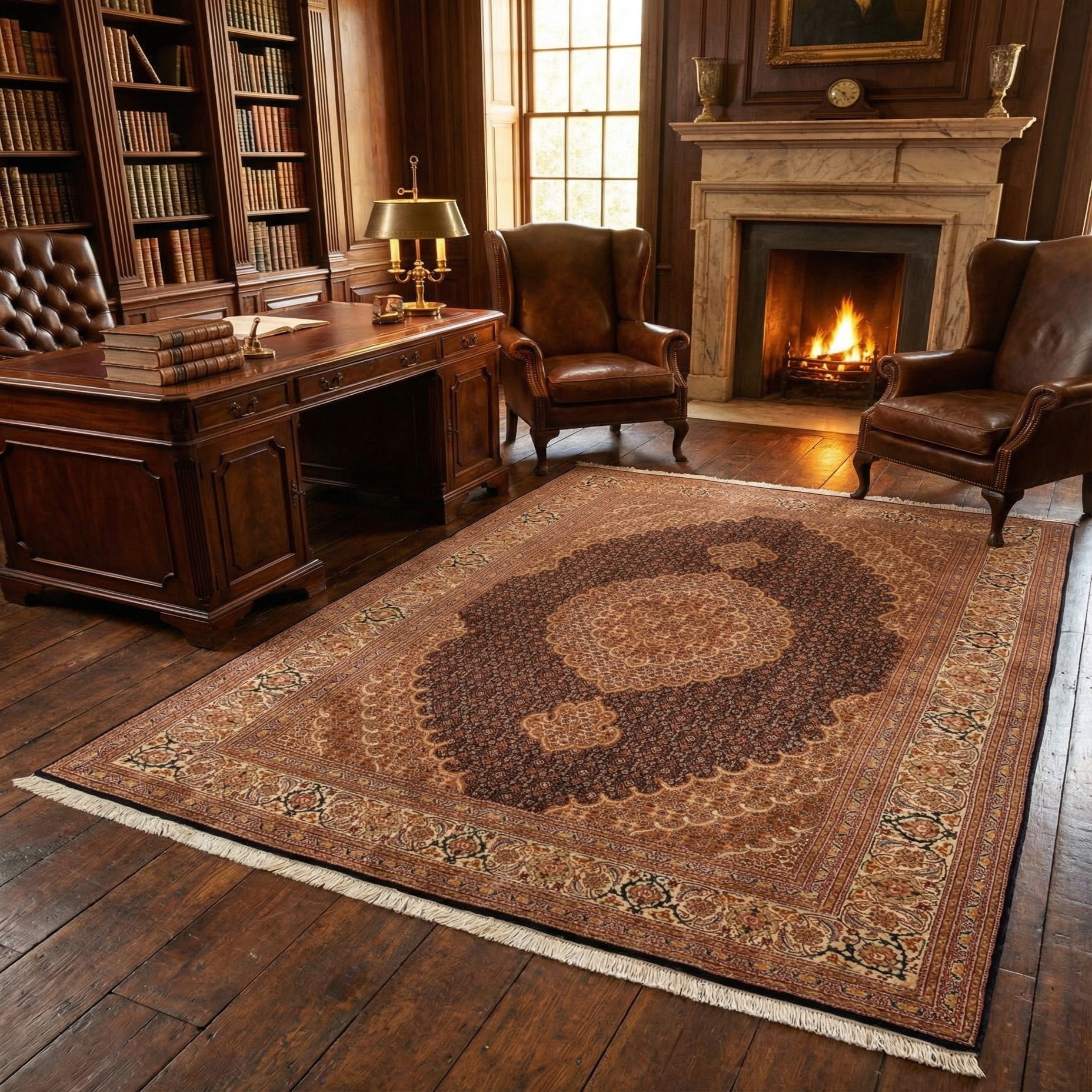 A Persian-inspired medallion rug with a warm orange field that sets the stage for a deep brown, almost black central medallion and finely detailed scalloped surrounds. The surface is filled with a dense, repeating floral lattice and small geometric motifs, while a cream outer border punctuates the composition with palmettes and vine work in olive, red and brown. Hand made of 100% wool, the rug has a low-to-medium pile that gives a softly resilient feel underfoot — smooth to the touch with enough texture to show the intricacy of the knotwork.