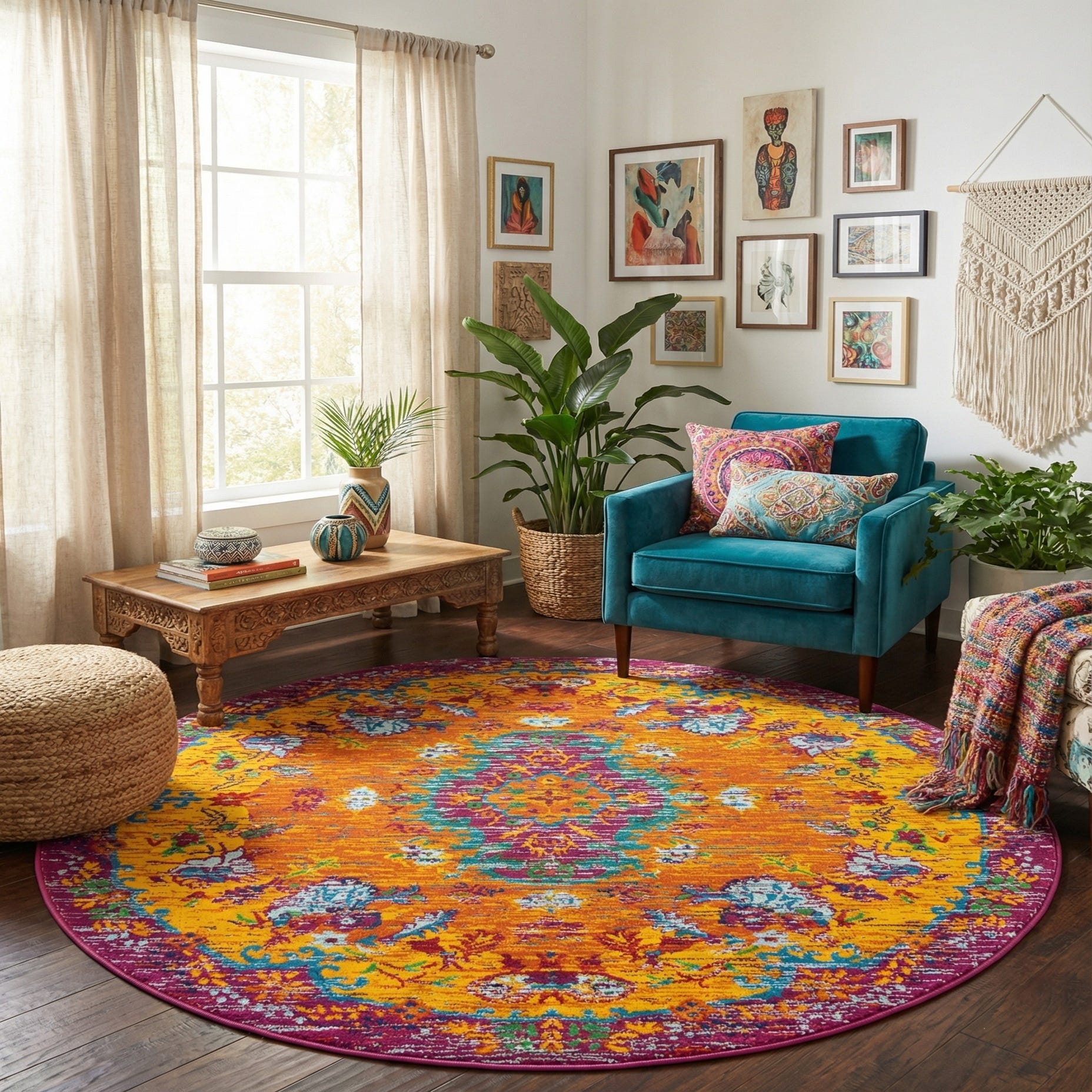 Machine-made from 100% polypropylene, the rug has a low, dense pile that feels smooth and slightly cushioned underfoot and holds saturated hues with clarity. Use it to anchor a round dining table, add a splash of color beneath a seating group, or brighten an entry or casual bedroom. Pair with warm wood furniture and neutral upholstery for contrast, or layer it into a bohemian or eclectic scheme with patterned pillows and mixed textiles.